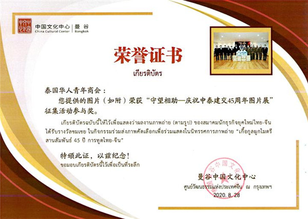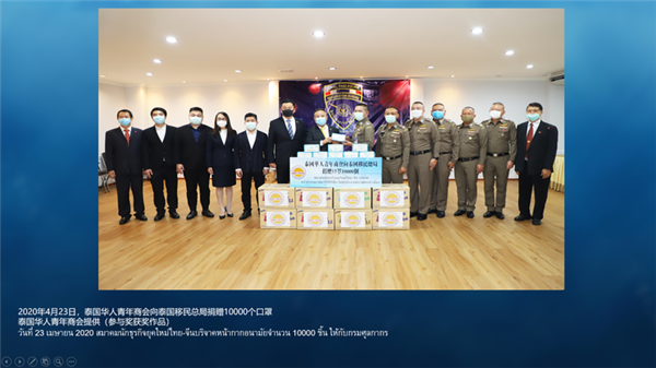 泰国华人青年商会报送的“发扬大爱 共抗疫情”系列图片,荣获参与奖项,泰国华人青年商会常务副会长林玮,总干事李焕泽等代表参加颁奖仪式。