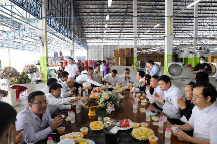 行程第二站:考察团一行来到东方红水果批发进出口企业,梁王允总经理热情地接待了考察团一行,并表示非常欢迎青商会各位企业家的来访,东方红水果批发进出口企业十分期待与青商会协同合作,共同发展。随后,在梁王允总经理的带领下,考察团一同参观了该工厂的榴莲打包作业线,了解了不同品种榴莲的口味、形状、成熟时间等特性。李嘉淳会长也分享了对尖竹汶水果行业的独特见解,并表示希望通过此次的考察访问对该行业的进一步发展扩大抱有很大的信心。