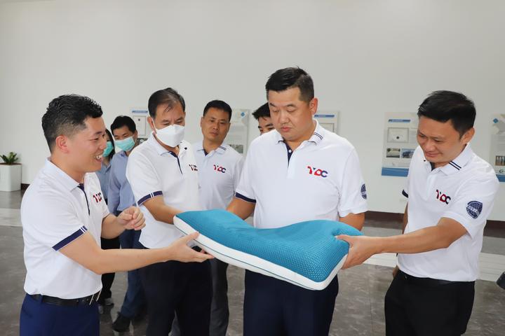 在结束参观后,姚鸿春常务副会长特别贴心的为考察团每一位成员准备了印有商会logo标识的乳胶枕礼品,并与大家合影留念。
