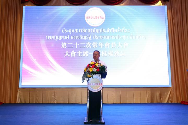 他在致词中说到,今天,我非常高兴主持泰国华人青年商会第22次常年会员大会,能够在这里再次见到各位新老朋友,倍感亲切!