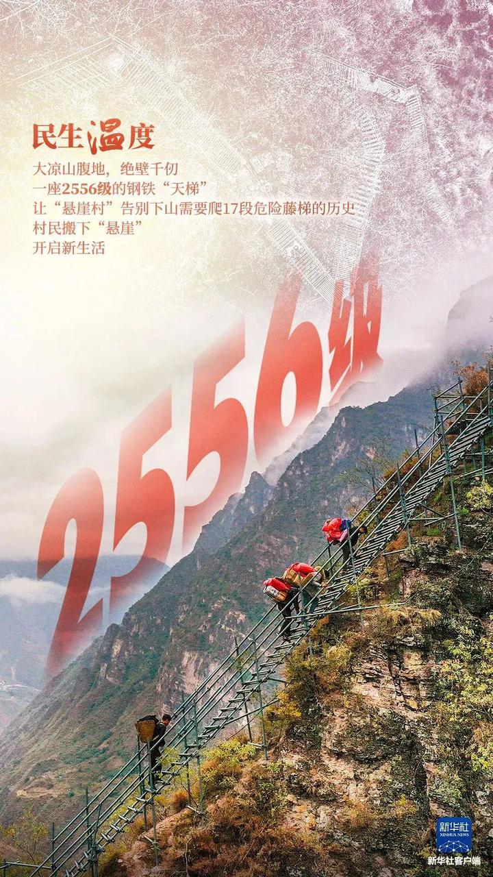 从百姓不断改善的生活,最能感受中国发展的温度。大凉山腹地,绝壁千仞。一座2556级的钢铁“天梯”,让“悬崖村”告别下山需要爬17段危险藤梯的历史,村民搬下“悬崖”,开启新生活。历时8年艰苦卓绝的奋斗,现行标准下9899万农村贫困人口全部脱贫,中国历史性地解决了绝对贫困问题。第一个百年奋斗目标实现,在中华大地上全面建成小康社会。