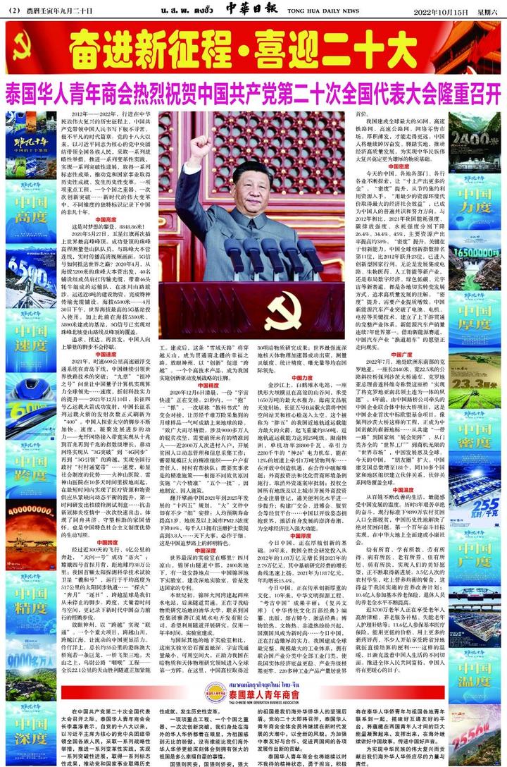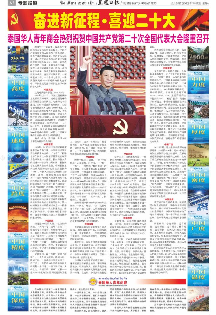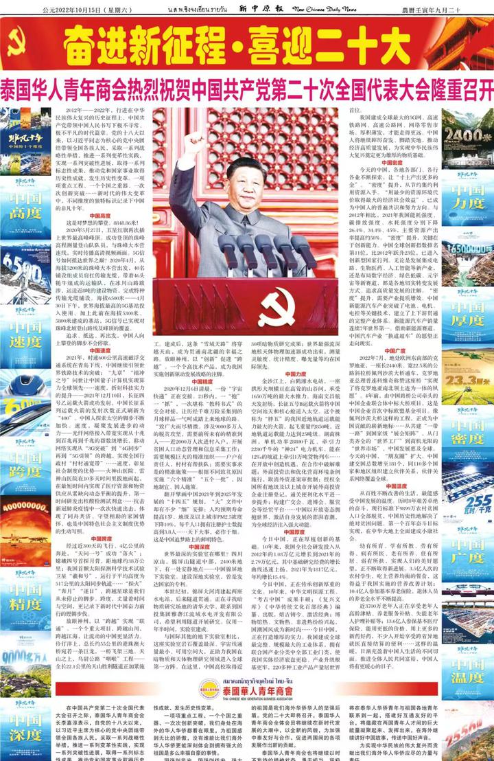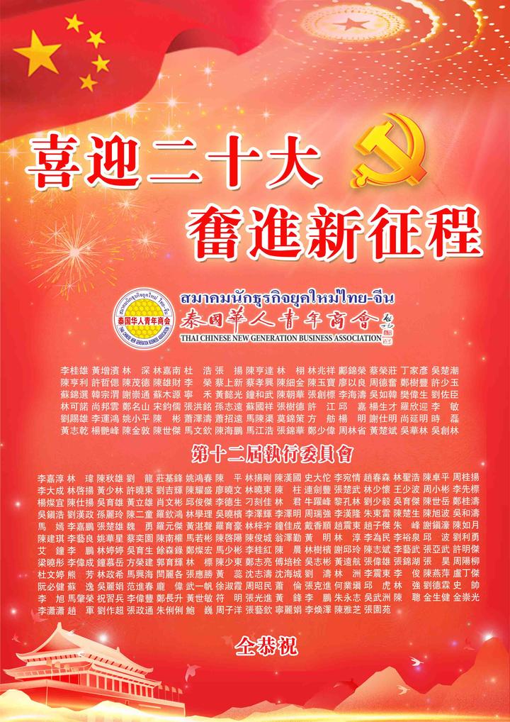 在中国共产党第二十次全国代表大会即将召开之际,泰国华人青年商会会长李嘉淳表示,自党的十八大以来,以习近平同志为核心的党中央团结带领全国各族人民,采取一系列战略性举措,推进一系列变革性实践,实现一系列突破性进展,取得一系列标志性成果,推动党和国家事业取得历史性成就、发生历史性变革。一项项重点工程、一个个国之重器、一次次创新突破,我们身处在海外的华人华侨都看在眼里,为祖国感到无比的骄傲,没有谁能比我们海外华人华侨更能深刻体会到拥有强大的祖国是多么幸福自豪的事情。国强则民安,国强则侨安,强大的祖国是我们海外华侨华人的坚强后盾。党的二十大即将召开,泰国华人青年商会全体会员将继续在新时代发展的大潮中,以全新的风貌,为加强中泰友好与合作、促进两国间的各项发展作出新的贡献。泰国华人青年商会也将继续以时不我待的精神状态,勇于担当,积极将在泰华人华侨青年与祖国各地青年联系到一起,搭建好互通友好的平台,将蕴藏在两国青年人才间的巨大能量凝聚起来、发挥出来,持续的引导海外华人华侨青年积极正面的了解祖国,增强他们对祖国的归属感认同感,在海外继续讲好中国故事,传播中国好声音。为实现中华民族的伟大复兴而贡献出我们海外华人华侨应尽的力量与责任。
