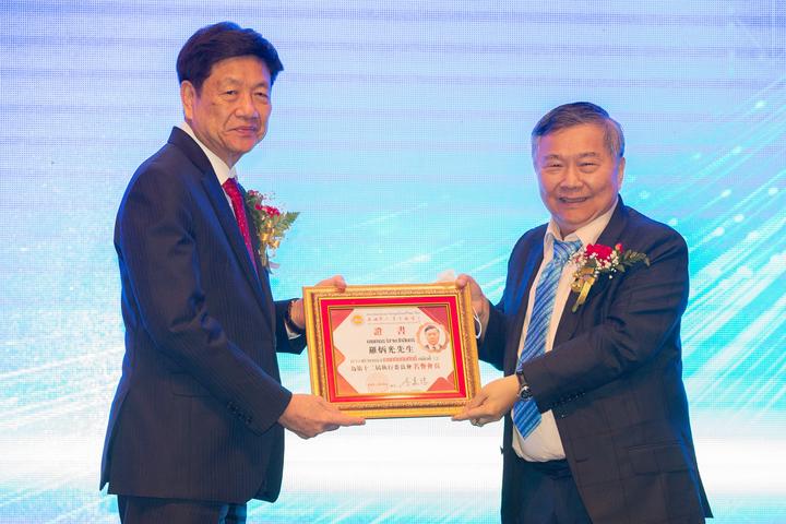 泰国中华总商会林楚钦主席向蔡孝兴名誉会长颁发荣誉证书
