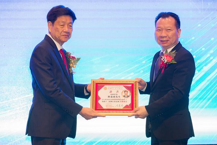 泰国中华总商会林楚钦主席向林嘉南名誉会长颁发荣誉证书