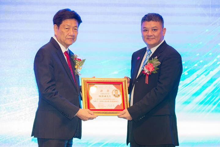 泰国中华总商会林楚钦主席向陈亨达名誉会长颁发荣誉证书