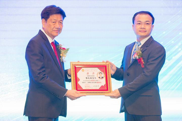 泰国中华总商会林楚钦主席向黎孔林副会长颁发任职证书