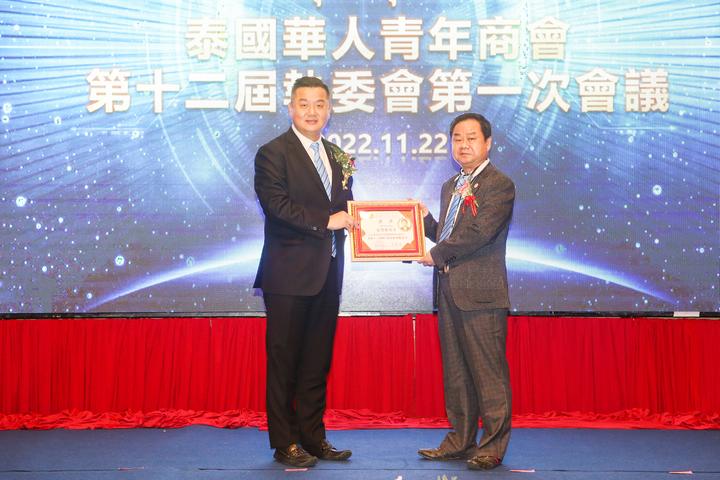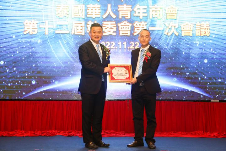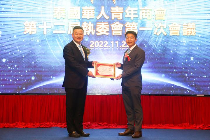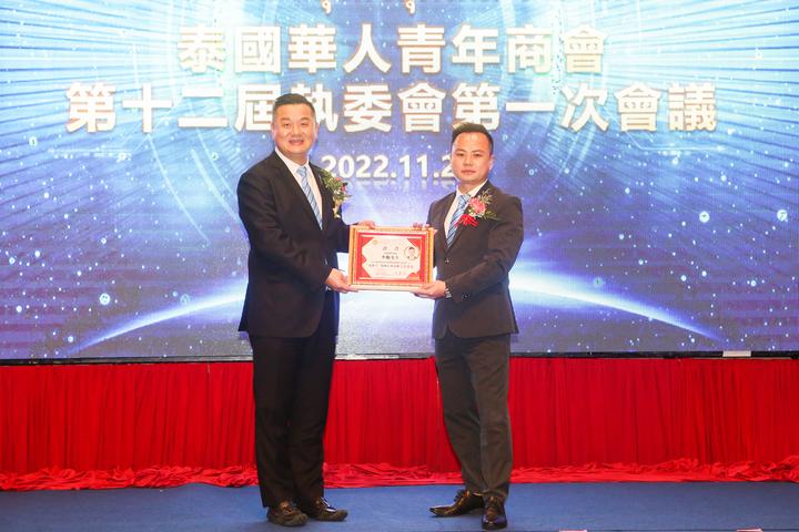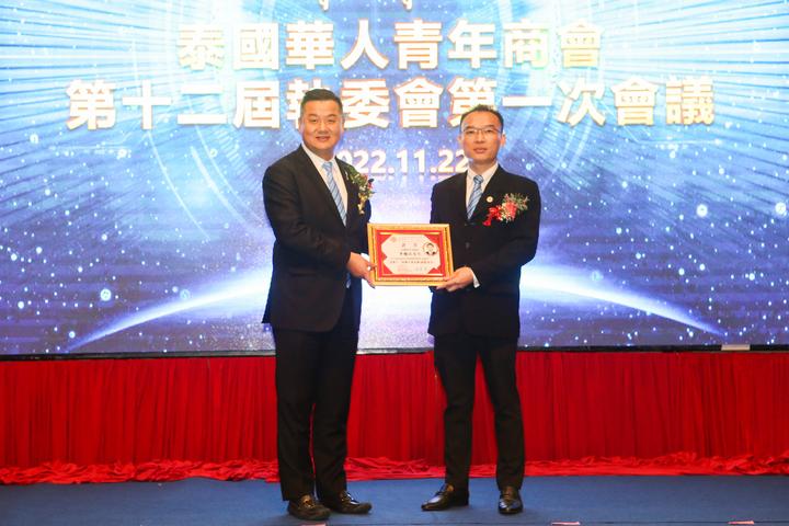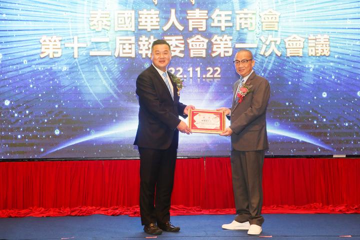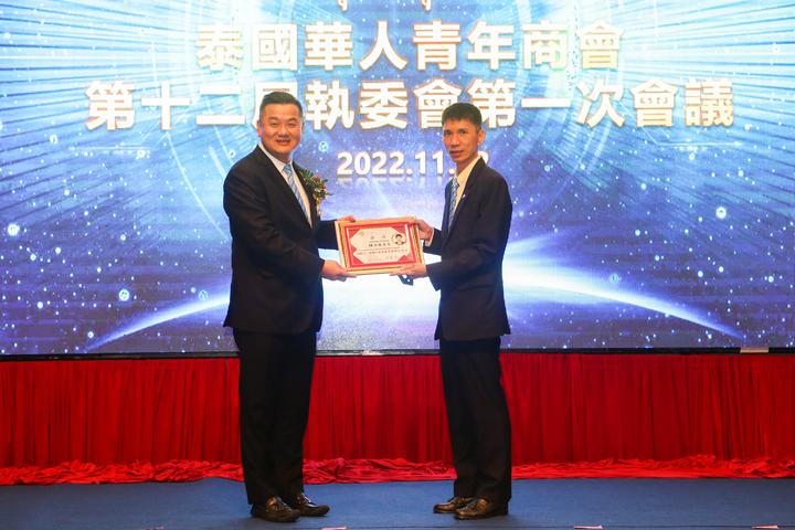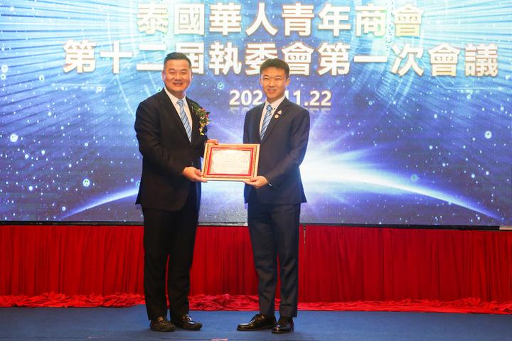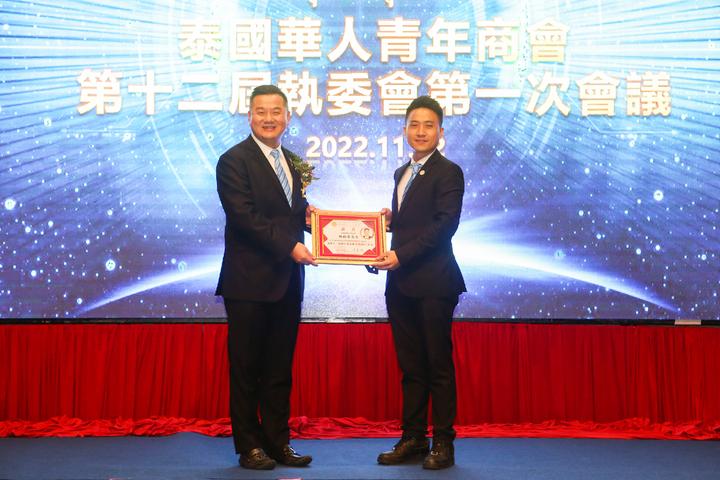 泰国华人青年商会第十二届执委会李嘉淳会长向主任委员李裕泉颁发任职证书