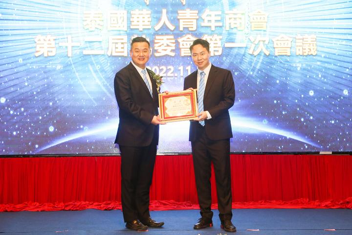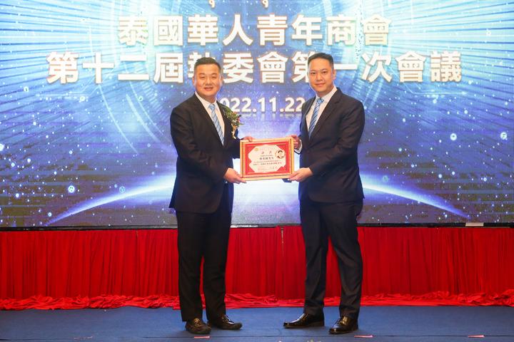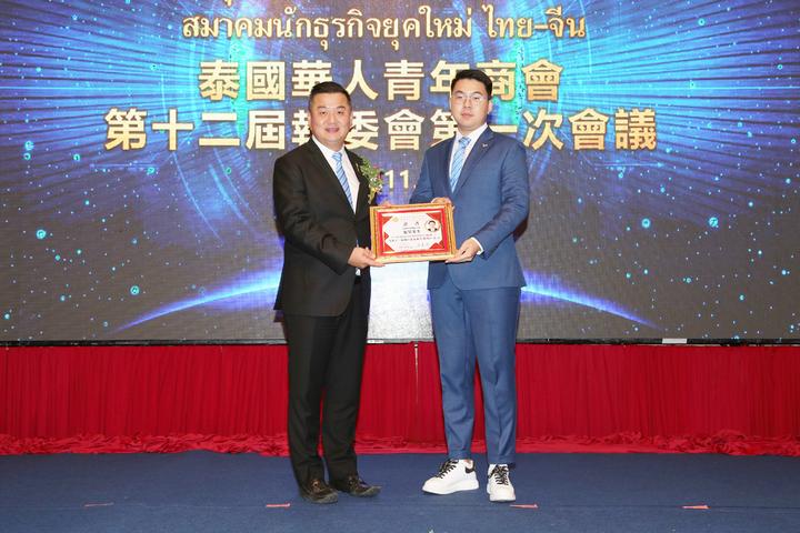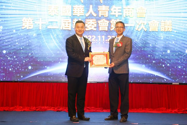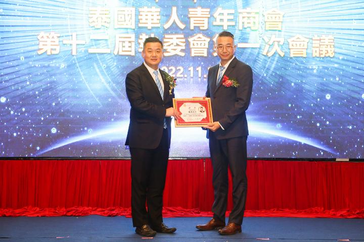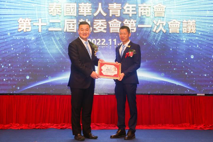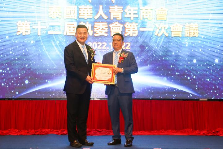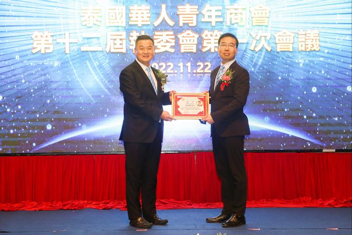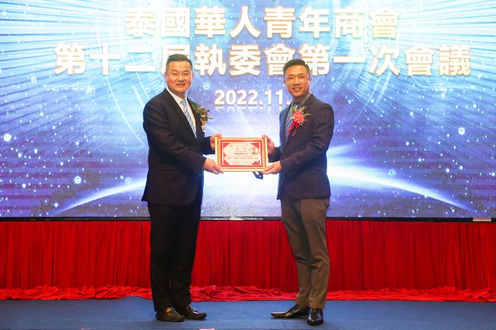 泰国华人青年商会第十二届执委会李嘉淳会长向主任委员李裕泉颁发任职证书