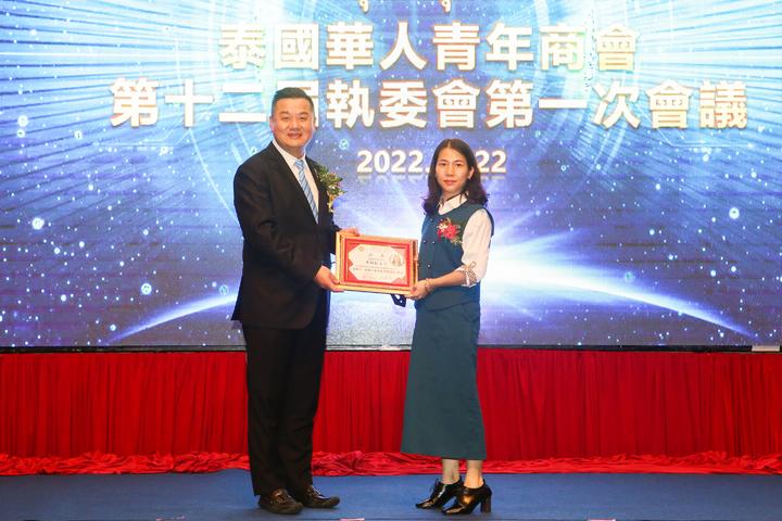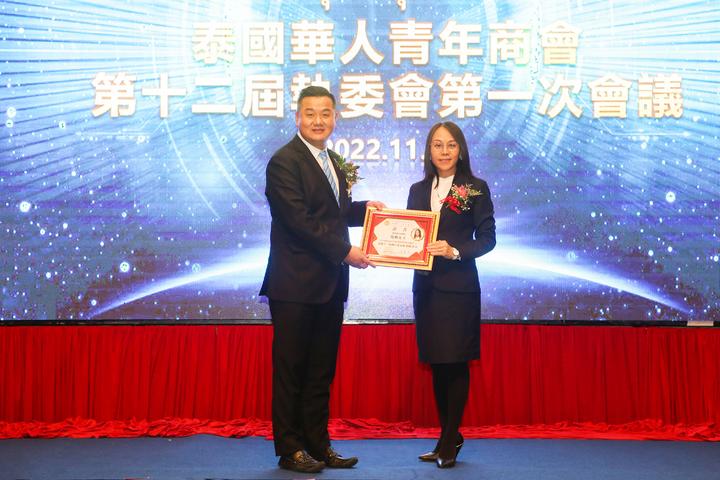 泰国华人青年商会第十二届执委会李嘉淳会长向副秘书长戴香顺颁发任职证书