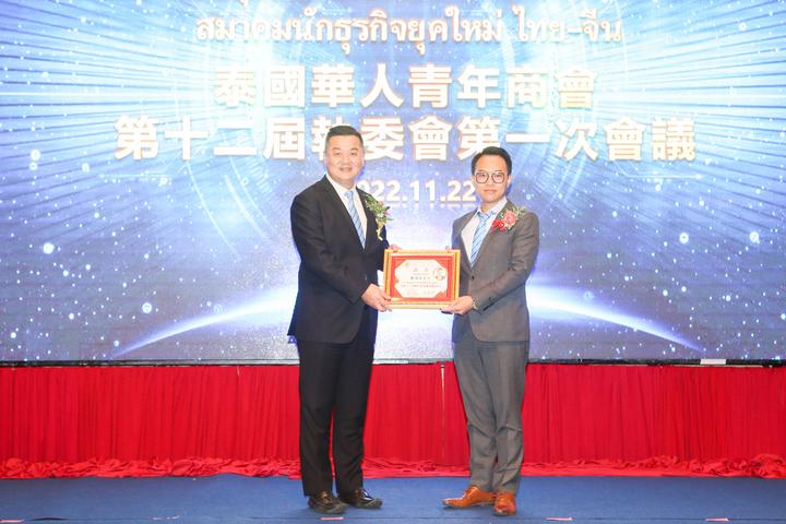 泰国华人青年商会第十二届执委会李嘉淳会长向主任委员翁泽勤颁发任职证书