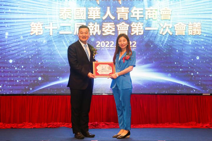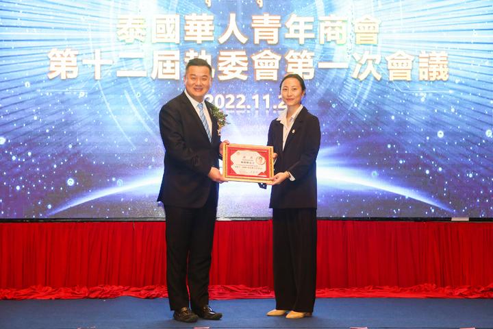 泰国华人青年商会第十二届执委会李嘉淳会长向主任委员林婷婷颁发任职证书