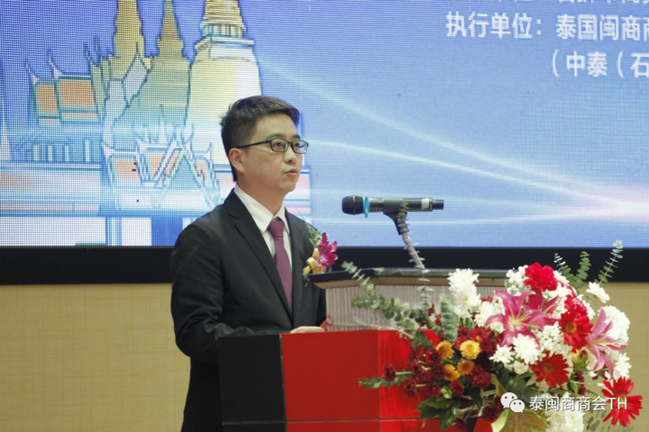 他说到,中国作为泰国最大贸易伙伴,也是泰国产品最大出口市场和主要外资来源国。近年来,中国企业赴泰投资增长较快,尤其是在服装纺织、数字经济、绿色经济、新能源产业等方面的合作潜力巨大。泰国华人青年商会成立23年以来,一直以推动泰中两国的友好往来、经贸合作、文化交流、民间团体合作等为己任,搭建合作共赢共享的平台与桥梁,一直努力为会内会员企业谋求商机,也多次与来自祖国各省市地区的对口企业开展了形式多样的经贸合作的活动,为企业来泰对接合作、帮助中国企业走出国门等做出了努力。今天,来自福建泉州的各位企业家与在泰企业家进行商贸推介及进行深入的交流洽谈。大家能够通过此次推介会,更好的增进彼此间的了解,深化合作,以自身的力量更大效应的推动双边地区的经贸发展。