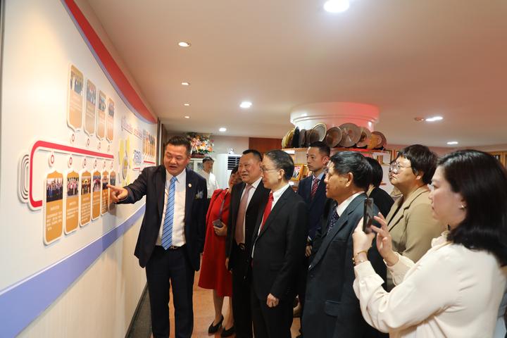李嘉淳会长首先带领来访团参观青商会历史文化墙,并向大家逐一介绍商会成立20年来的重要事迹。并一同观看泰国华人青年商会成立20周年纪录片《不忘初心 砥砺前行》、汕头市进出口商会成立20周年纪念片《我们来自三江》。