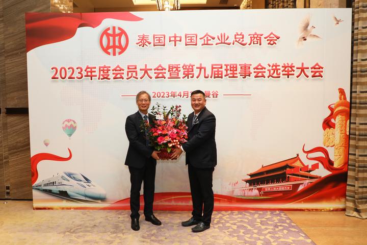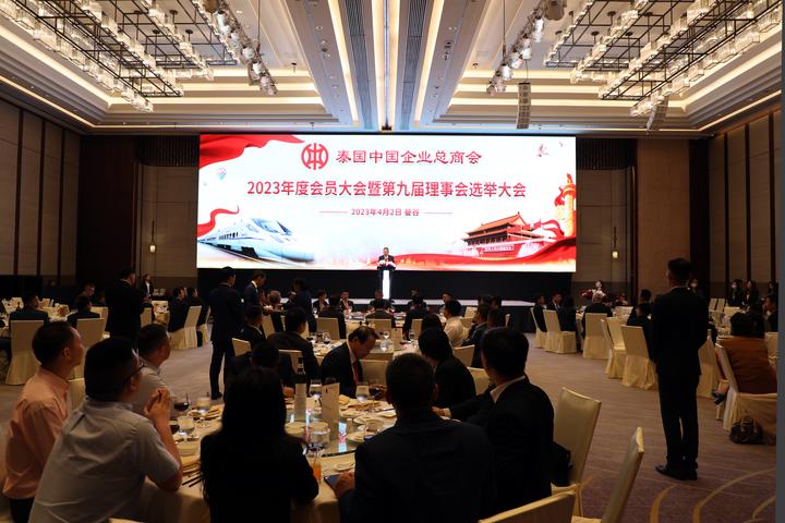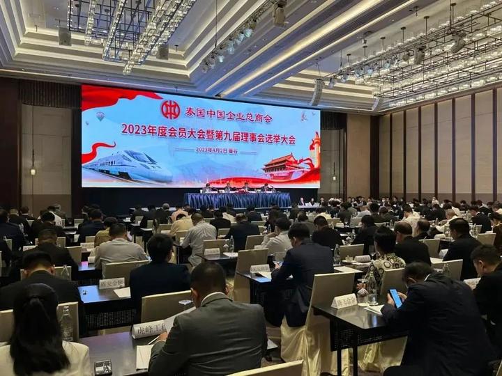 2023年4月2日下午,泰国中国企业总商会2023年度会员大会暨第九届理事会选举大会在曼谷康纳德酒店会议厅隆重召开,中国驻泰国大使韩志强出席会议并发表重要讲话,泰国中华总商会主席林楚钦、泰国中华总商会副主席暨各行业工会执行主任李桂雄、泰国华人青年商会会长李嘉淳、泰中侨商联合会主席邝锦荣、泰国贸易院副秘书长庄介湘,以及200多名在泰中资会员企业代表参加了本次会议。