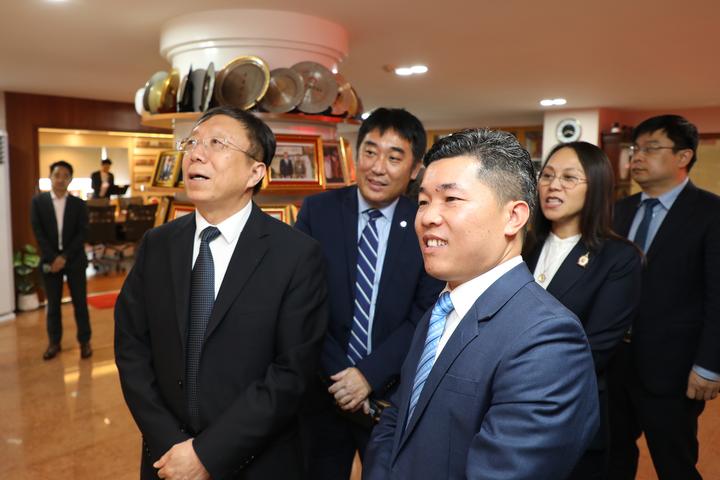 姚鸿春常务副会长首先带领陈晓强副市长一行参观青商会历史文化墙,向大家简单介绍商会成立20年来的重要事迹。并一同观看泰国华人青年商会成立20周年纪录片《不忘初心 砥砺前行》。