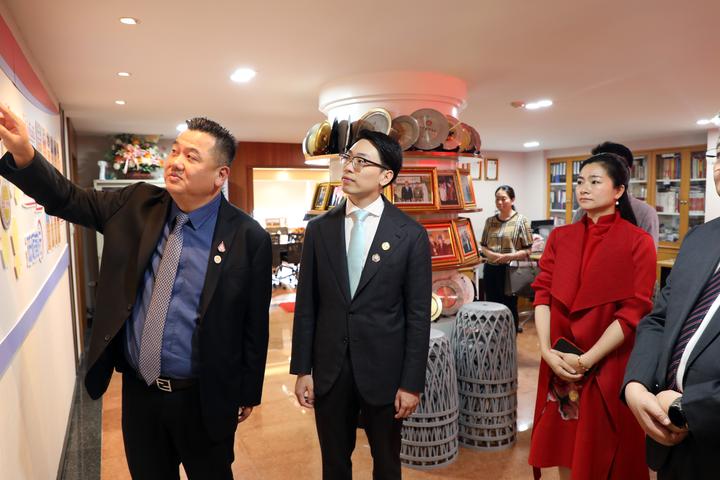 李嘉淳会长首先带领代表团成员一同参观了青商会历史文化墙,并观看泰国华人青年商会成立20周年纪念片《不忘初心 砥砺前行》。
