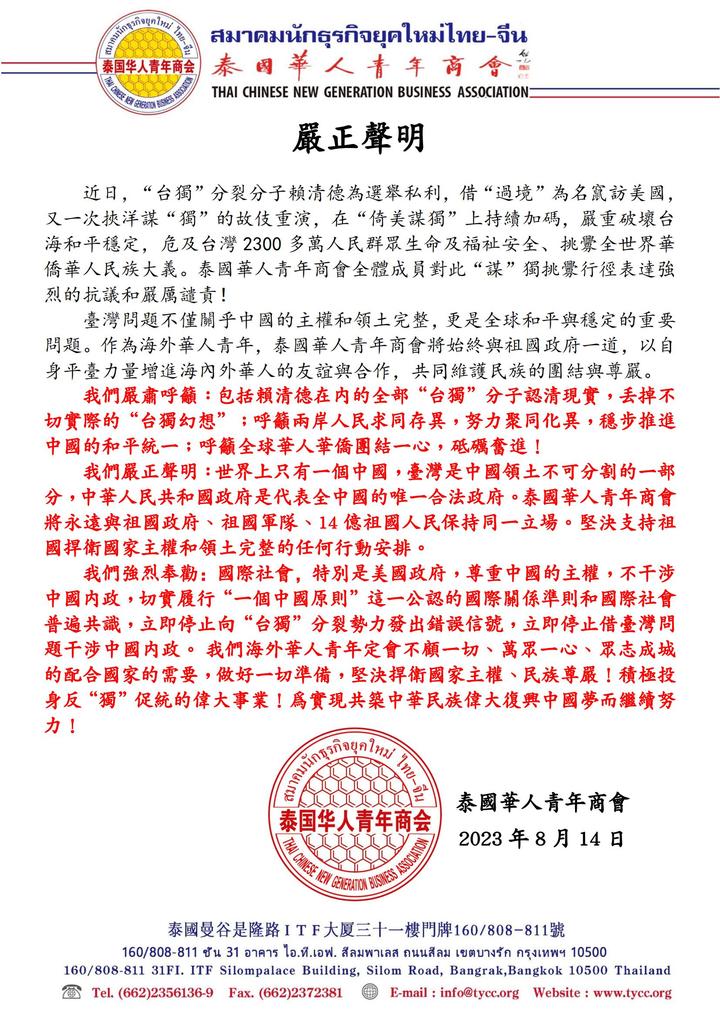 近日,“台独”分裂分子赖清德为选举私利,借“过境”为名窜访美国,又一次挟洋谋“独”的故伎重演,在“倚美谋独”上持续加码,严重破坏台海和平稳定,危及台湾2300多万人民群众生命及福祉安全、挑衅全世界华侨华人民族大义。泰国华人青年商会全体成员对此谋“独”挑衅行径表达强烈的抗议和严厉谴责!