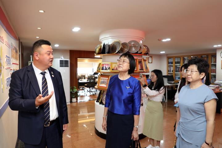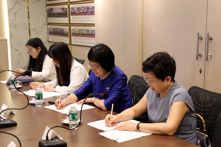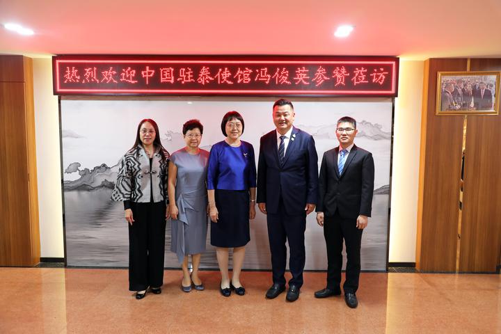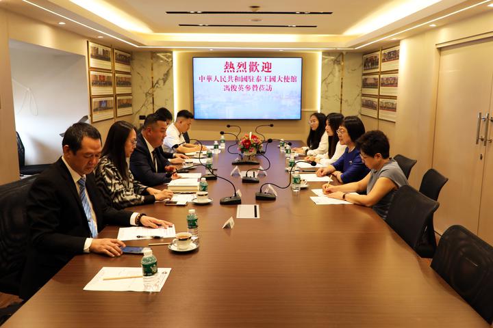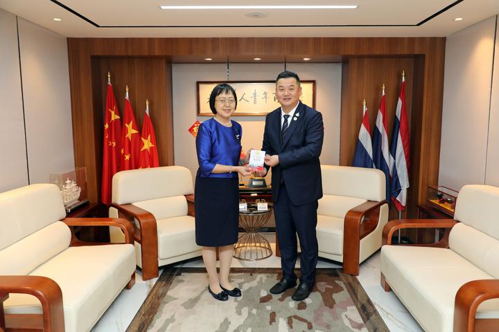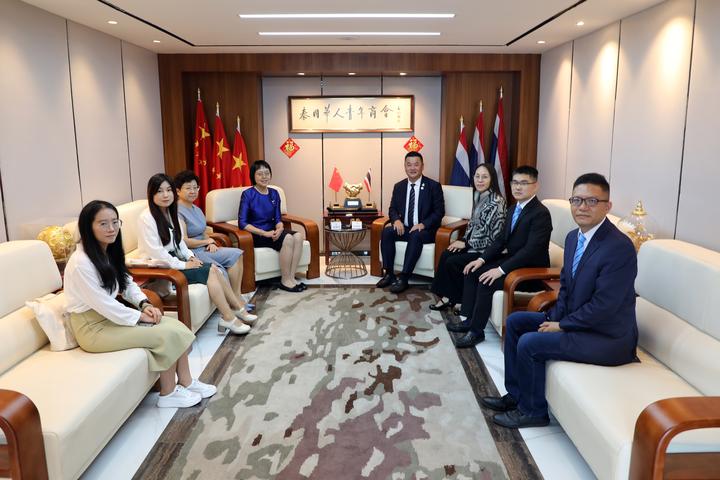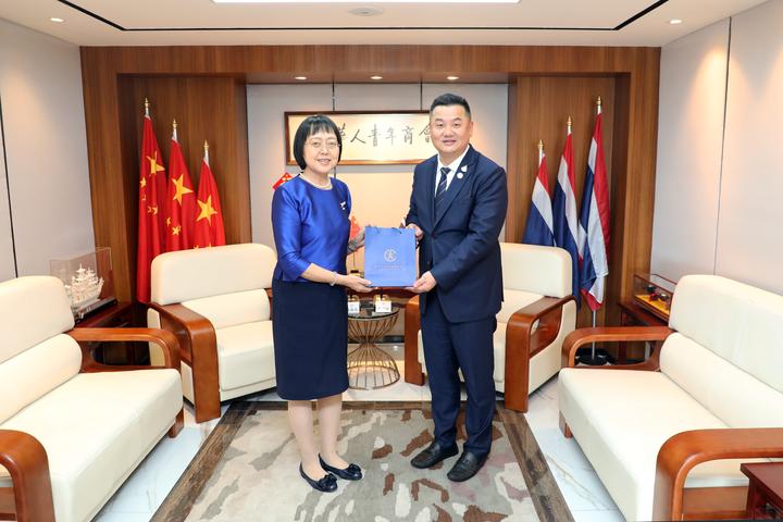 2023年8月16日,青商会李嘉淳会长在商会会议室热情接待了中国驻泰国大使馆冯俊英参赞、一等秘书王欢教授莅访,双方相互问候,并举行座谈。副秘书长马嫣、黄湛声、常务委员马兴海、林政希、执行委员赵世欣、总干事李焕泽等陪同接待。