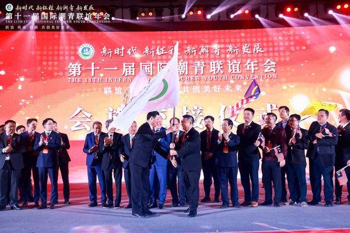 李奕标会长从第十一届国际潮青联谊年会大会主席陈思宇接过会旗后,交给马潮联青代表团,第十二届国际潮青联谊年会大会主席拿督黄瑞雷接旗。国际潮青联合会永远会长陈幼南、赵利生、李桂雄、陈文雄、叶志光、陈才雄、执行会长张俊勇、黄德安等见证承前启后继往开来的历史性时刻。