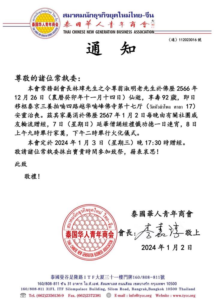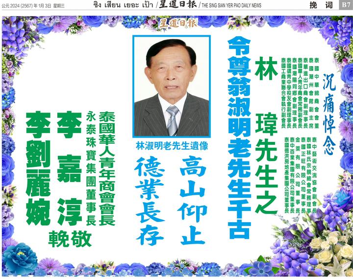 泰国华人青年商会常务副会长林玮先生之令尊翁淑明林老先生于佛历2566年12月26日仙逝、假越华南峰佛寺第十七厅安灵治丧、兹其家属涓于佛历2567年元月2日每晚由有关社团戚友轮流赠经祭拜、7日功德礼忏、8日上午九时举行家奠、下午二时举行火化礼。