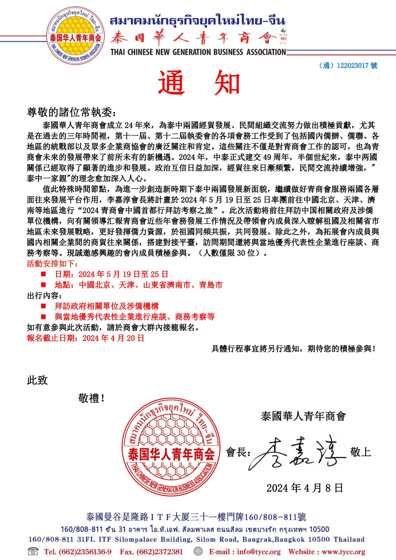 值此特殊時間節點,為進一步創造新時期下泰中兩國發展新面貌,繼續做好青商會服務兩國各層面往來發展平台作用,李嘉淳會長將計畫於2024年5月19日至25日率團前往中國北京、天津、濟南等地區進行“2024青商會中國首都行拜訪考察之旅”。此次活動将前往拜訪中国相關政府及涉僑單位機構,向有關領導汇報青商會近些年會務發展工作情況及帶領會內成員深入瞭解祖國及相關省市地區未來發展戰略,更好發揮僑力資源,於祖國同頻共振,共同發展。除此之外,為拓展會內成員與國內相關企業間的商貿往來關係,搭建對接平臺,訪問期間還將與當地優秀代表性企業進行座談、商務考察等。現誠邀感興趣的會內成員積極參與。(人數僅限30位)。