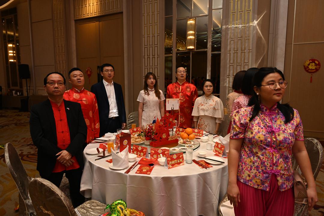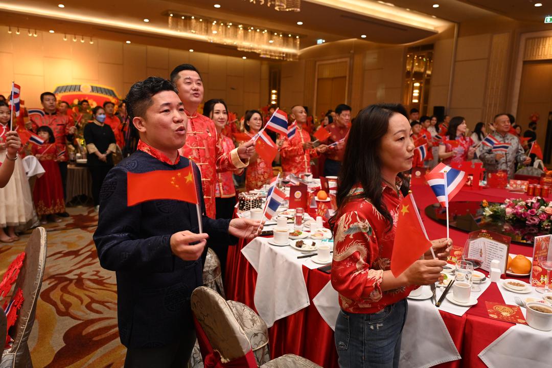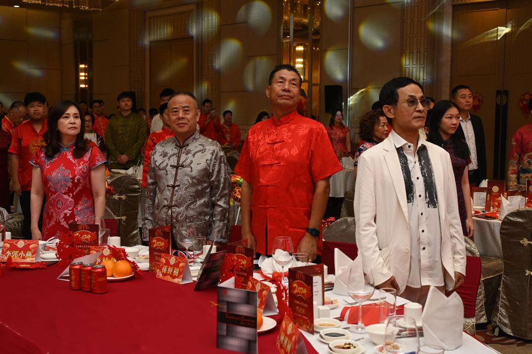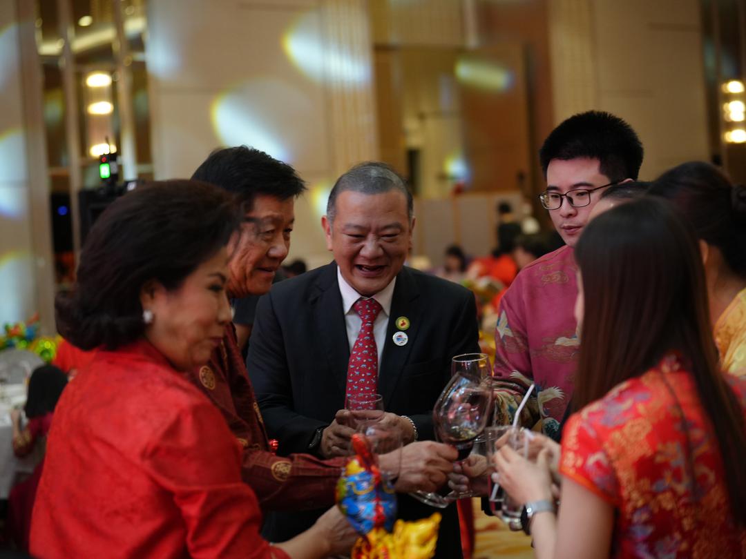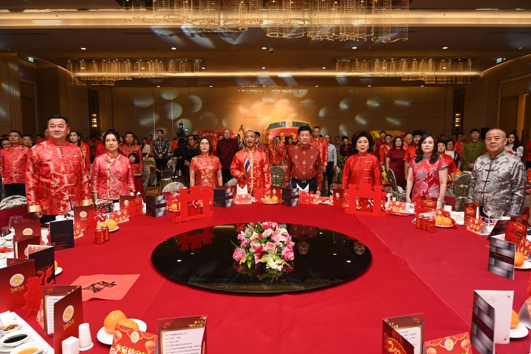 随后,李嘉淳会长邀请泰国中华总商会林楚钦主席,泰国警察总署助理署长素拉蓬·猜赞警中将,泰国华人青年商会李桂雄永远名誉会长,林深名誉会长、孙经树名誉会长,青商会常务副会长等一同上台举杯向祖国人民及全球华侨华人恭贺龙年新春。