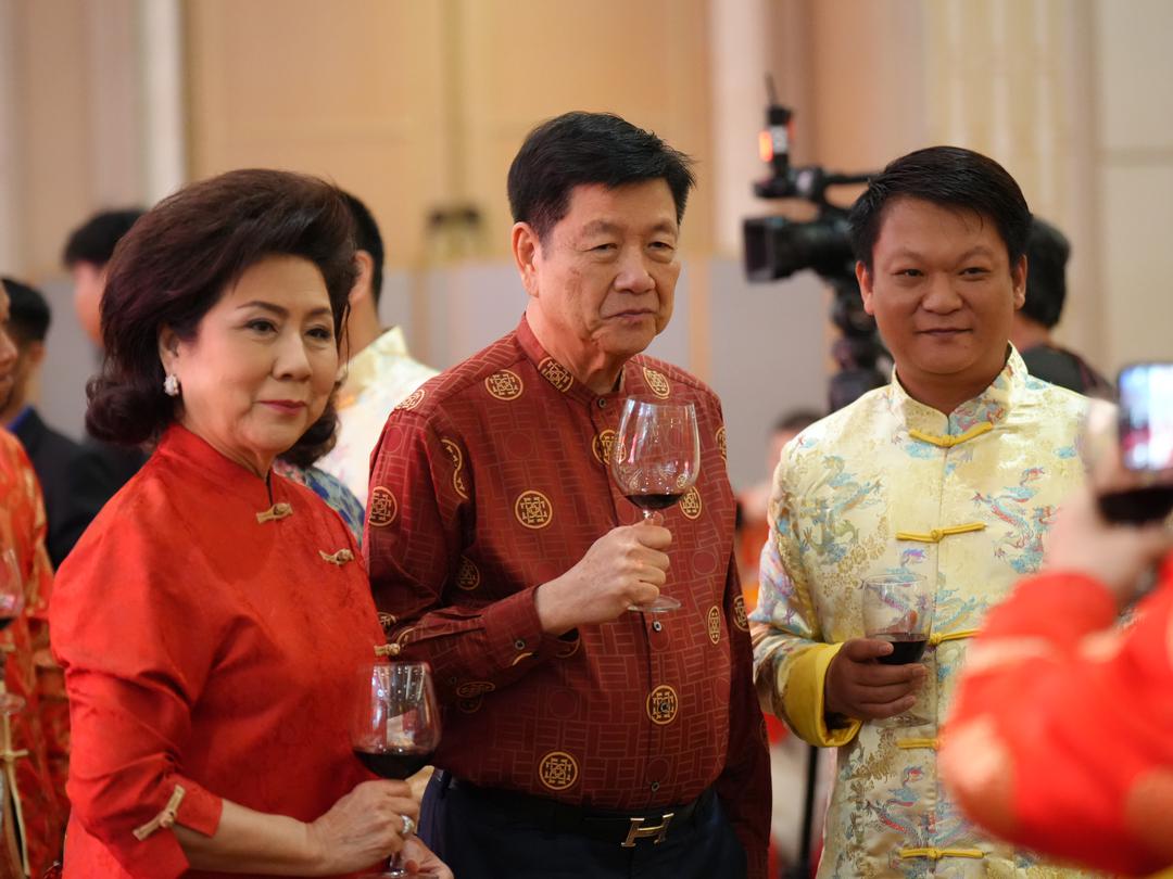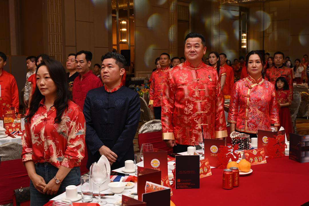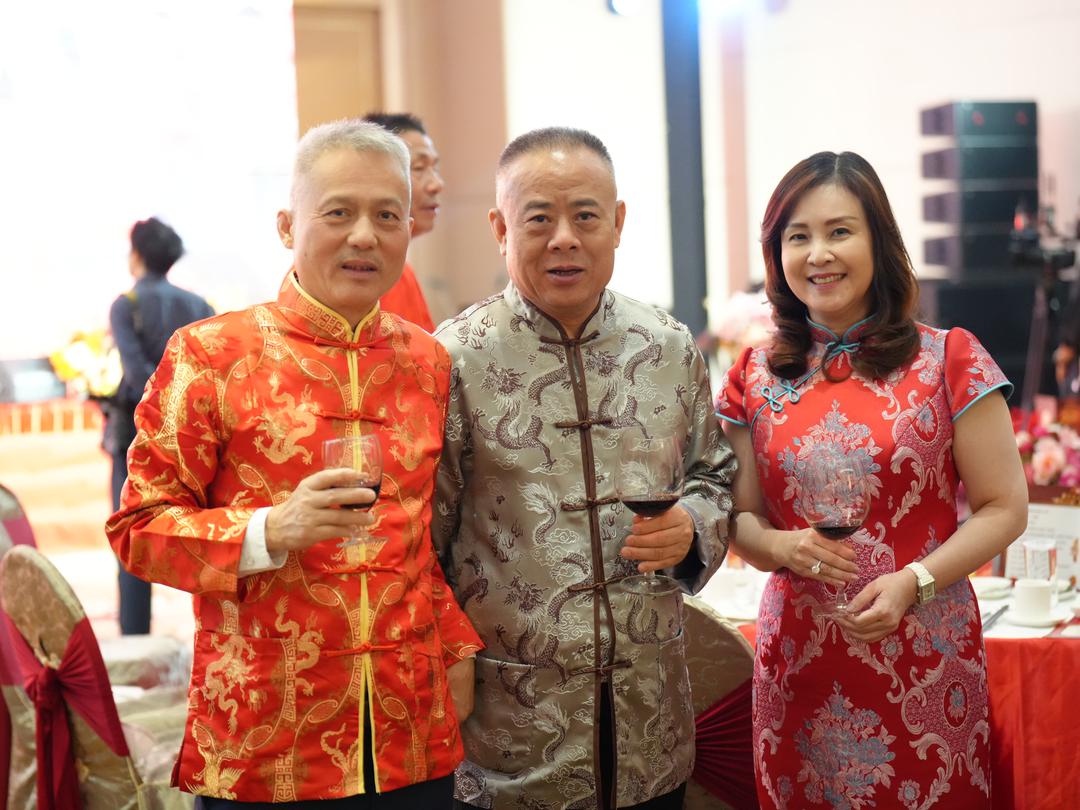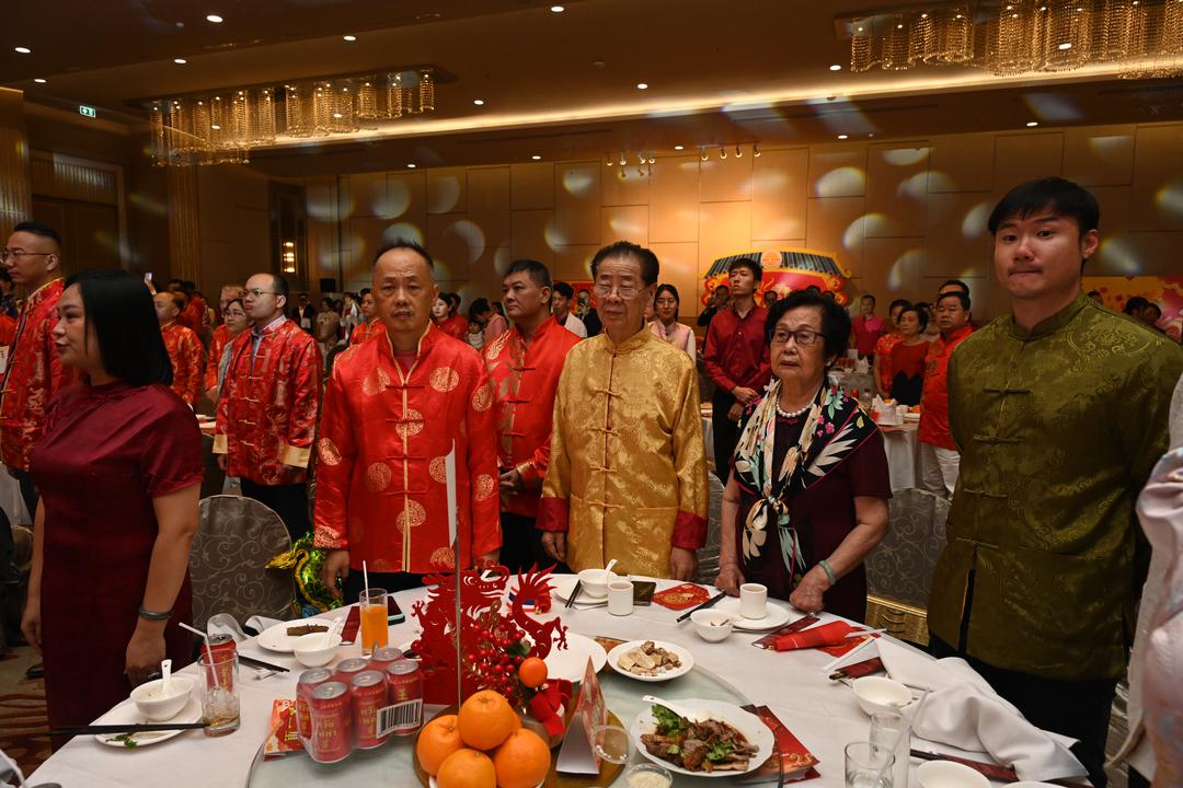 随后,李嘉淳会长邀请泰国中华总商会林楚钦主席,泰国警察总署助理署长素拉蓬·猜赞警中将,泰国华人青年商会李桂雄永远名誉会长,林深名誉会长、孙经树名誉会长,青商会常务副会长等一同上台举杯向祖国人民及全球华侨华人恭贺龙年新春。
