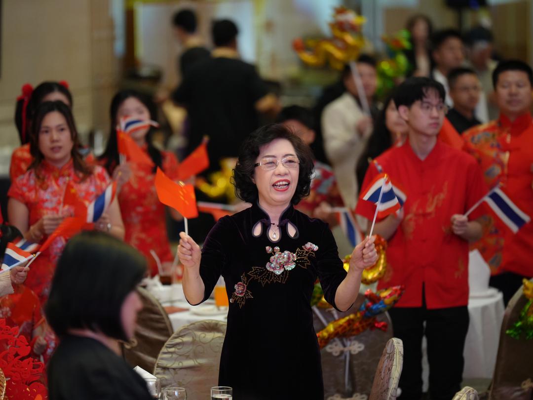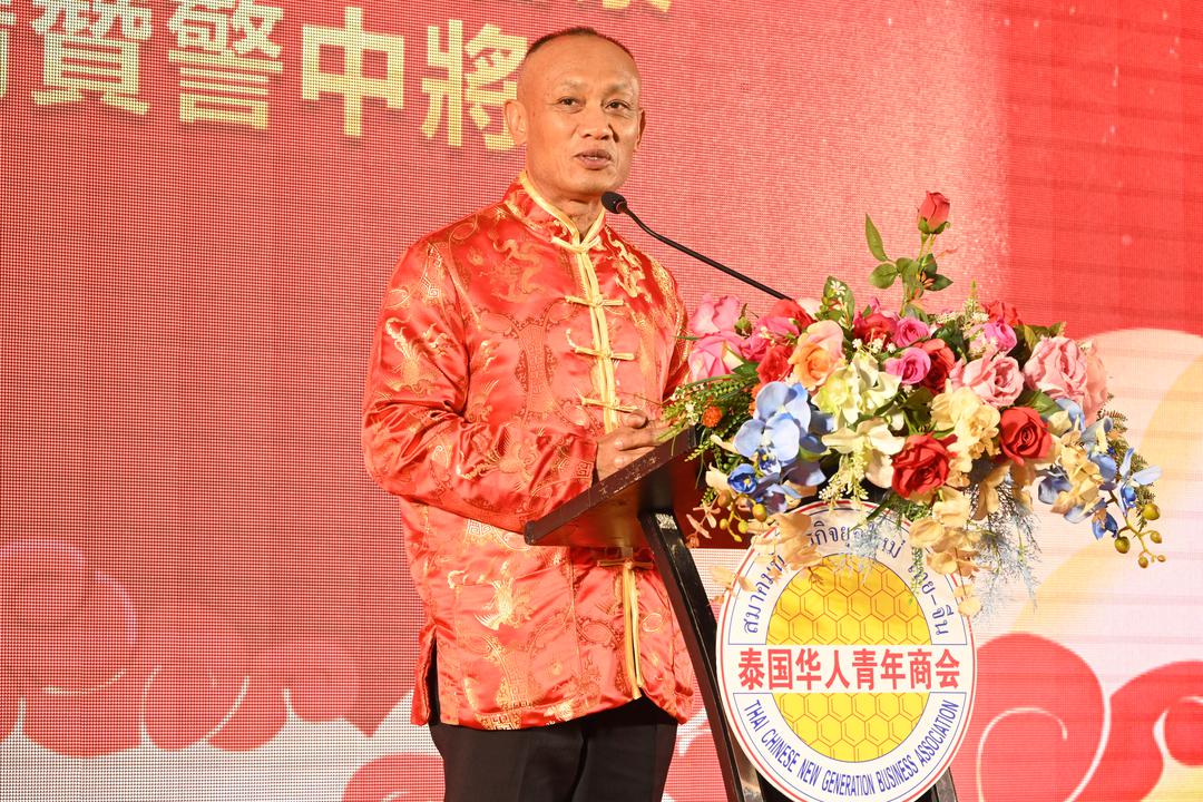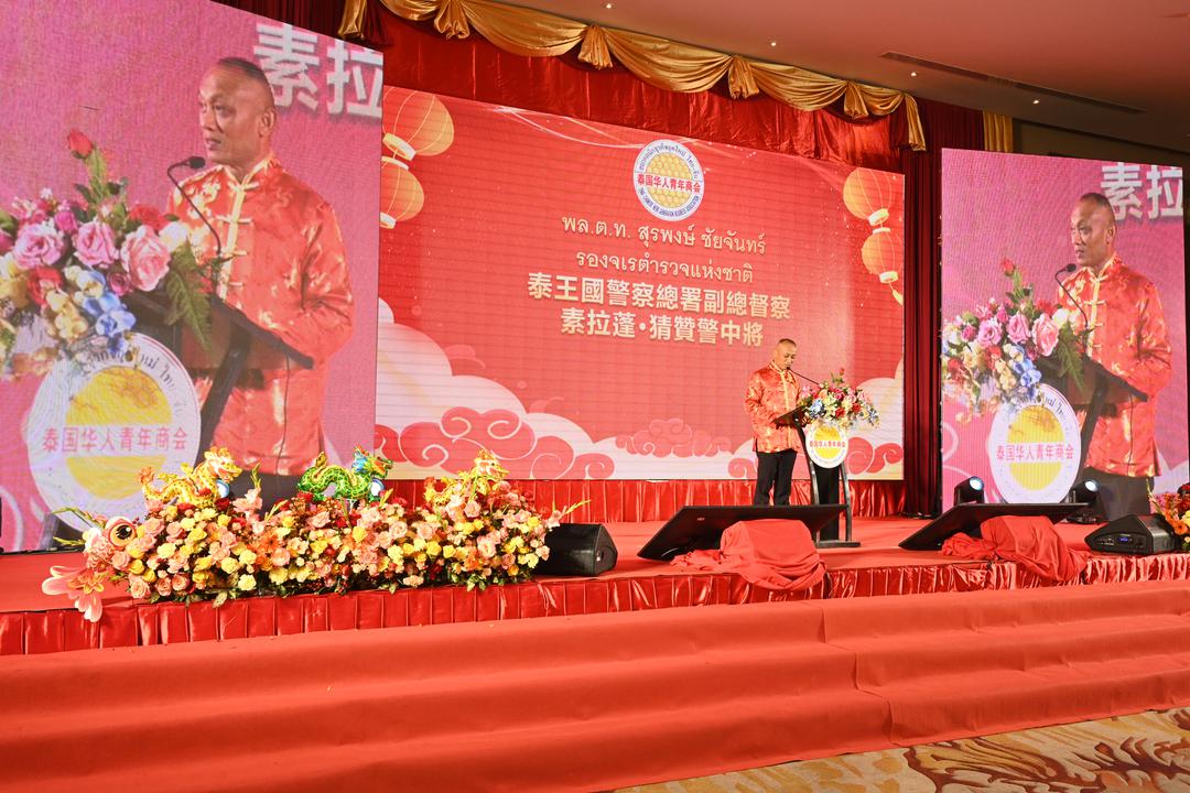泰王国警察总署副总督察素拉鹏警中将上台致辞。他感谢青商会再次邀请自己来出席春节联欢晚会,去年他也有幸参与,对青商会团结奋斗的精神面貌、会员们的热情友好印象深刻。今年是龙年,对于中泰两国人民都是吉祥之年,衷心祝福青商会及会员们新年步步高。他还现场用中文为大家送上了“新正如意、新年发财”的祝福。