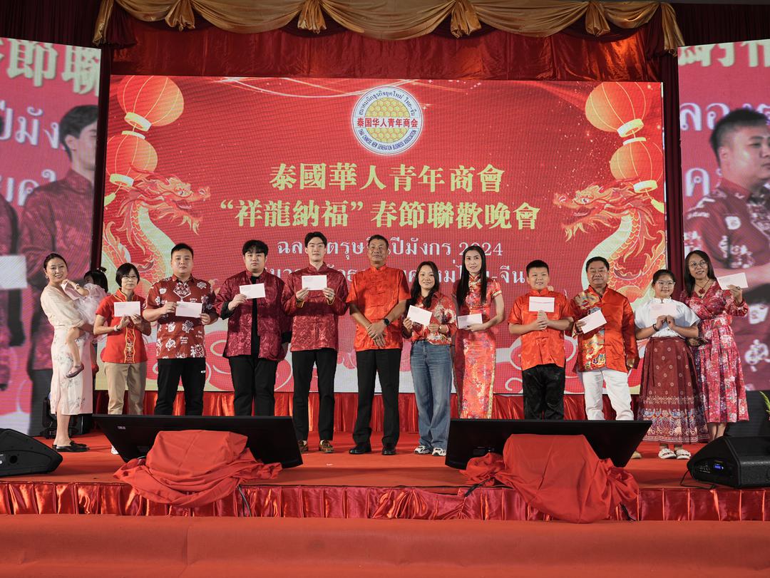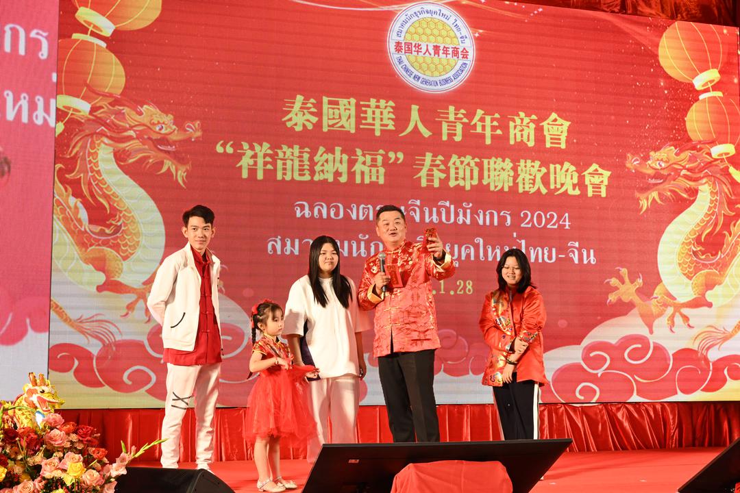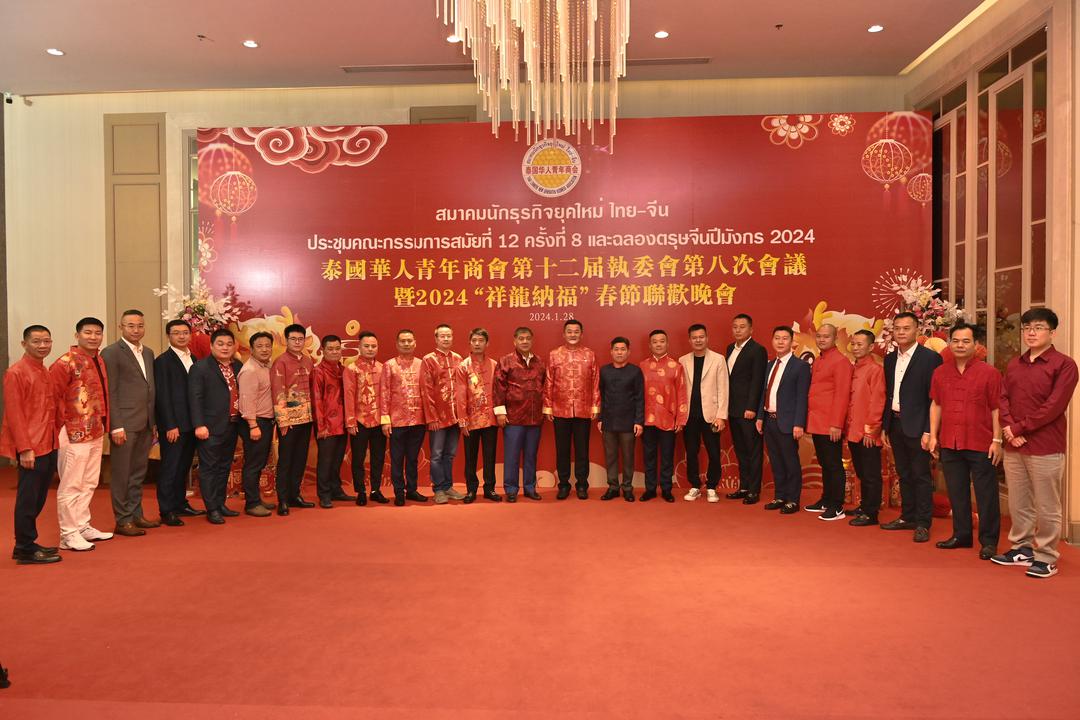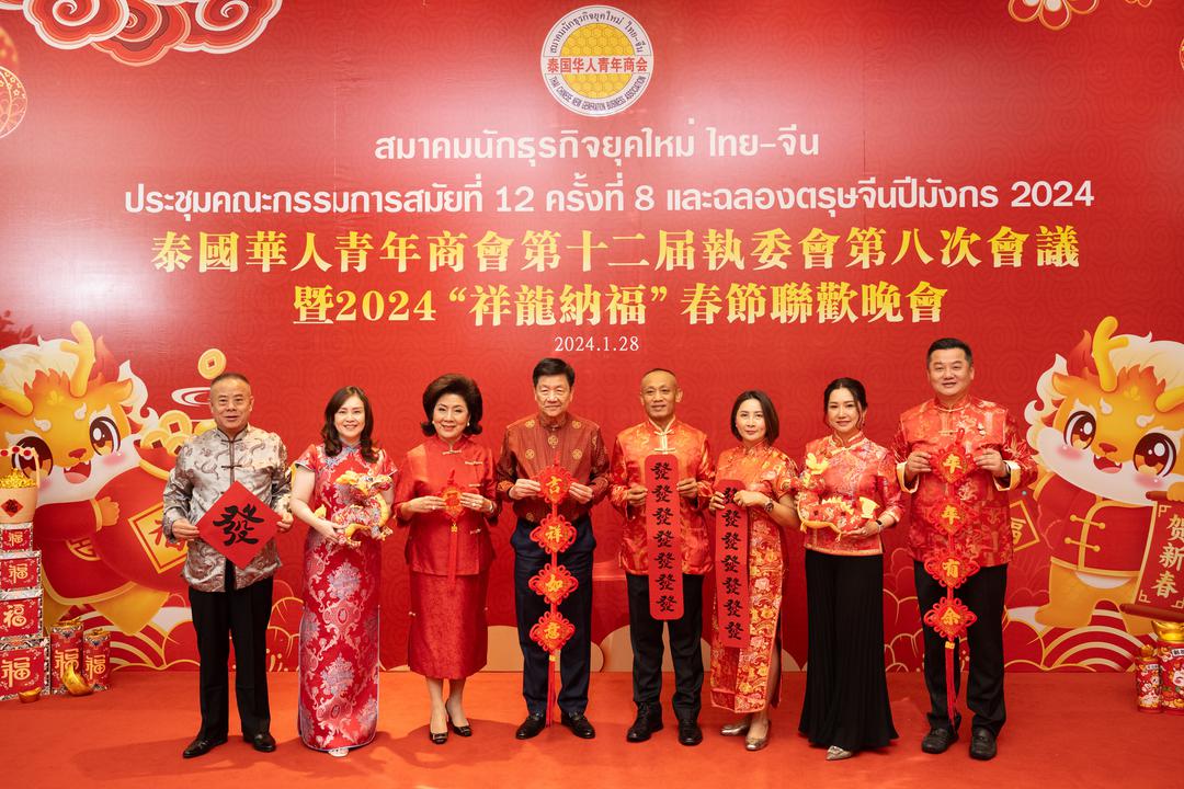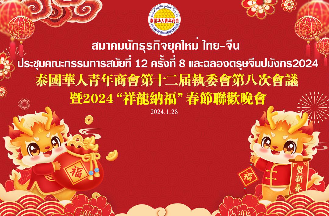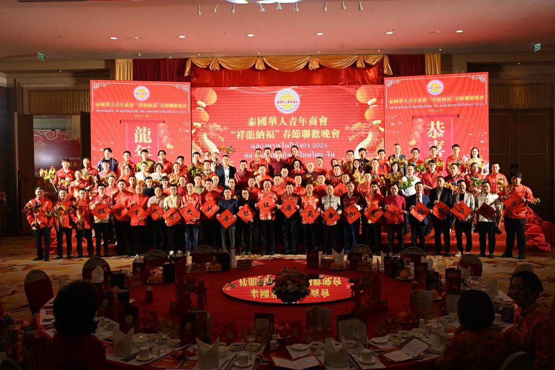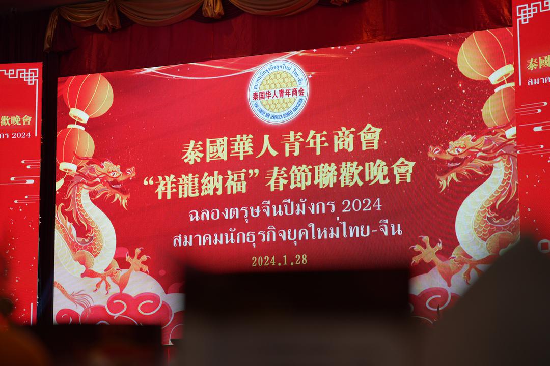 2024年1月28日,泰国华人青年商会第十二届执行委员会第八次会议暨2024“祥龙纳福”春节联欢晚会于在中总九楼光华堂隆重举行。泰国中华总商会林楚钦主席携夫人、泰国警察总署副总督察素拉蓬·猜赞警中将携夫人,泰国华人青年商会李桂雄永远名誉会长携夫人,泰国华人青年商会林深名誉会长携夫人,泰国华人青年商会名誉会长孙经树暨家人,泰国华人青年商会李嘉淳会长携夫人、常务副会长姚鸿春及夫人、林扬刚、陈汉国及家属、史大佗及夫人、李宛情及夫人等近百位常执委携家人亲属出席参加,欢聚一堂,其乐融融,共迎2024中国农历龙年新春的到来!