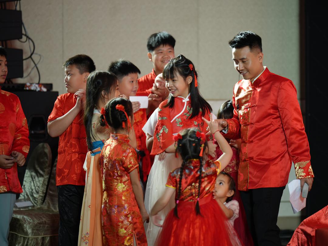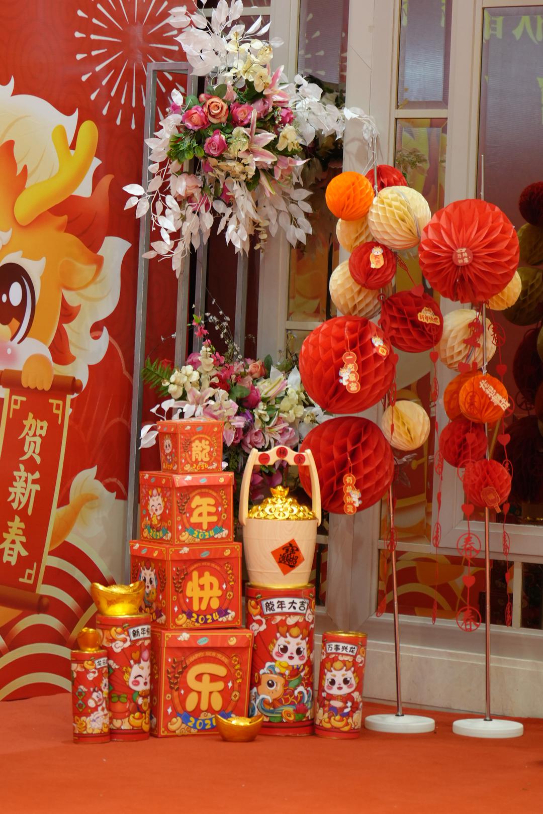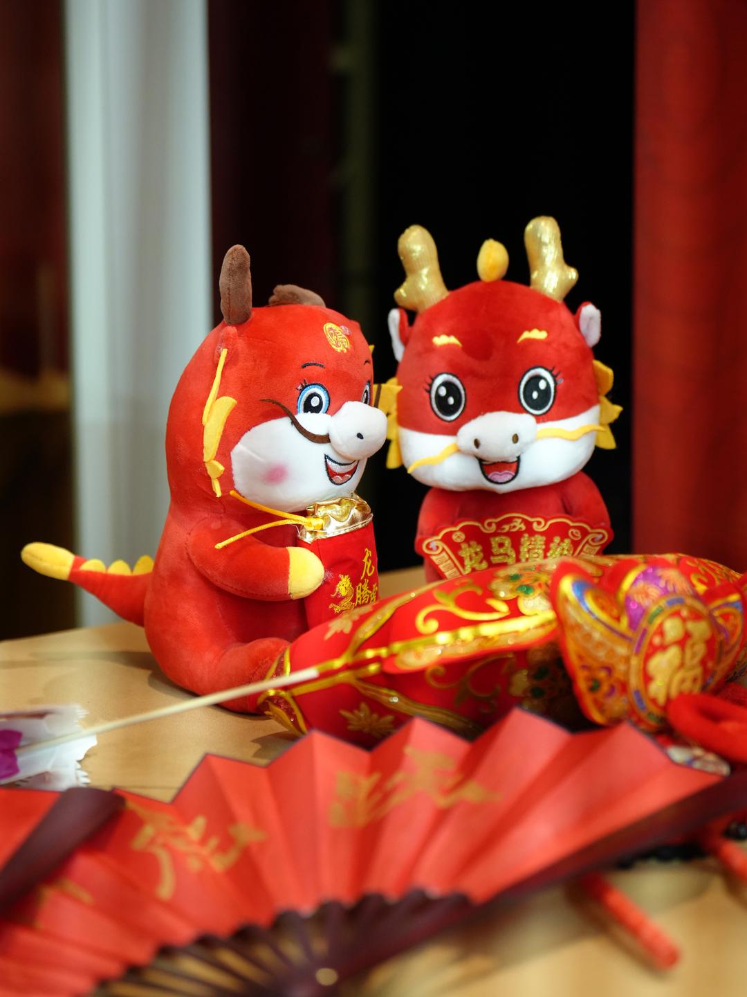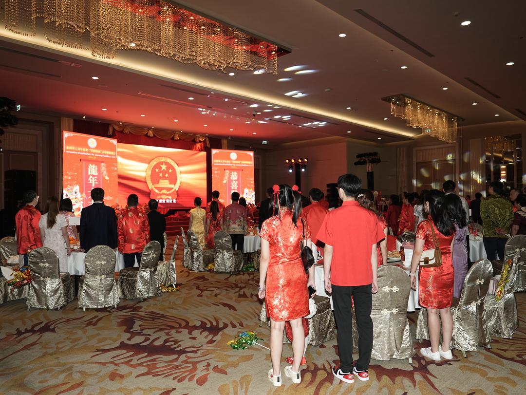 执委会议结束,下午18时,2024“祥龙纳福”春节联欢晚会准备开始,青商会成员及家属孩童们穿上象征中华传统文化的唐装、汉服、马面裙等亮相。商会办公厅特别为会内成员贴心准备了龙形气球和玩偶、福字、对联等各色拍摄道具,在晚会开始前欢乐拍照,现场年味浓厚。