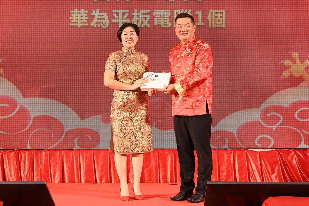 春节联欢晚会自然少不了发放春节福利,商会准备了多项礼品和现金红包。奖品分别有特等奖价值58500泰铢,由李嘉淳会长赞助其辖下永泰珠宝集团宝石手链一条、一等奖价值38888泰铢重15.4克纯黄金手链一条,二等奖价值16888泰铢,华为平板电脑一台;三等奖5000泰铢现金红包5个,四等奖3000泰铢现金红包10个,幸运奖1000泰铢现金红包50个为会内成员们送出吉祥如意;同时,林楚钦主席、李桂雄会长、李嘉淳会长及商会其他领导纷纷参与互动,为会员和家属们抽取礼品、共玩游戏,各位领导们更现场追加派发现金红包,现场高潮不断,喜气洋洋。