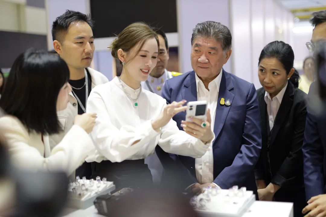 更令人振奋的是,本次活动也引起了泰国政府的关注,泰国本届副总理兼商务部长普坦·威乍耶猜亲临淘宝专属直播间,与本次溯源活动主办方淘宝直播境外生态&淘宝全球购负责人王一玫(花名:蔓笛),以及淘宝头部主播烈儿宝贝深度交流,亲身感受直播经济的强大活力,体验了淘宝直播的独特魅力,更是对本次活动给予了高度评价。此番互动不仅彰显了对淘宝直播的充分肯定和认可,还为淘宝直播生态的全球化发展注入了新动力,更是对泰中国际贸易的推广起到巨大作用。此外,直播现场也吸引了诸多泰国本土及海外珠宝展商的关注,纷纷与平台工作人员建联以期待未来合作。