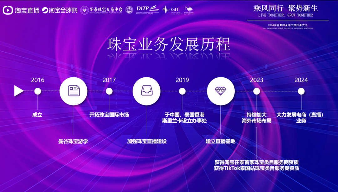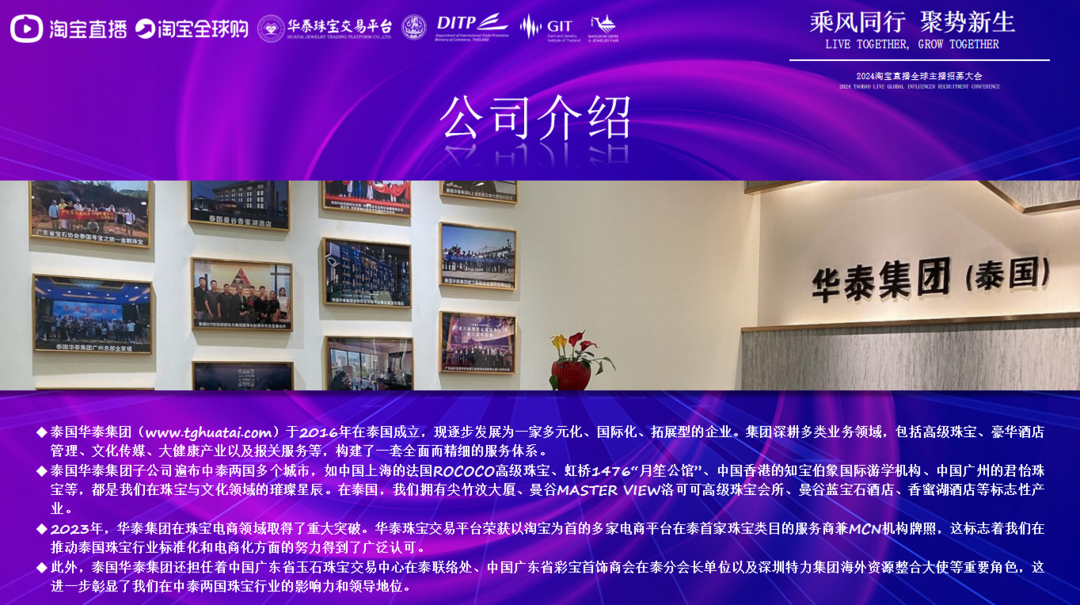 无论是在文化多样性浓厚的中国香港,技术先进的日本,还是广阔的北美大陆,都有着一批批富有才华和激情的直播主播,他们用自己的方式讲述着品牌的故事,连接着全球的消费者。这些主播们不仅为淘宝直播平台带来了新鲜的血液,也为全球消费者提供了更加多元化和个性化的购物选择。此次招募大会,我们把视线转向泰国,这个被称为“天使之城”的美丽国度。以其丰富的文化遗产、独特的艺术风格和珍贵的自然资源闻名于世,特别是在珠宝、手工艺品和旅游领域,有着无可比拟的优势。通过此次在泰国的招募大会,我们期待发掘更多具有国际视野和本土文化背景的直播主播,让他们成为连接中国与泰国,乃至全球消费者的桥梁。