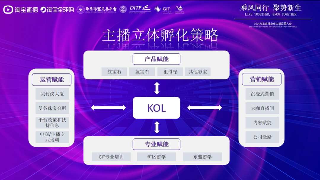淘宝直播主播生态运营总负责人叶镇参先生在致辞中说到,淘宝在珠宝这个领域那么多年做了非常深度的运营,也是中国珠宝电商新零售的开拓者,而彩色宝石是珠宝行业近一年增速仅次于珍珠的第二大品类,且其品类多样性和专业知识的复杂程度对很多主播是巨大的挑战,随着三年疫情的结束,以及世界经济环境的变化,我们发掘了泰国宝石源头供应链巨大的潜在机会,几年前淘宝全球购带领大批主播前往缅甸开拓了翡翠玉石市场,去年我们在东京珠宝展开拓珍珠溯源直播取得了很不错的成绩,今年相信随着中泰贸易进一步融合发展,有DITP、GIT、华泰这样的专业合作伙伴,淘宝直播有信心在泰国将彩色宝石行业发展出新的繁荣生态。