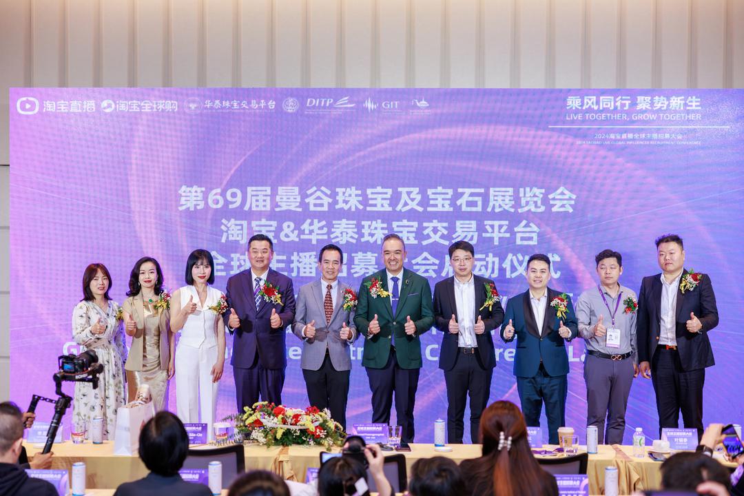 在泰国商业部国际贸易促进司副司长蓬维特·斯拉昂先生、泰国珠宝学院首席执行官苏美德·巴松蓬先生、泰国华人青年商会会长李嘉淳先生、淘天集团-淘宝直播总经理叶镇参先生、淘天集团淘宝直播总监王一玫女士、域骉控股(广东)有限责任公司董事长李帅先生、萃玥珠宝品牌主理人易瑶瑶女士、诚好珠宝(广州)有限公司董事长刘文辉先生、淘天集团-淘宝直播生态运营主管白艳女士、泰国华泰集团、华泰珠宝交易平台董事长赵震东先生等领导代表共同按启动球,在全场嘉宾的倒数见证下,第69届曼谷珠宝及宝石展览会淘宝&华泰珠宝交易平台全球主播招募大会正式启动。