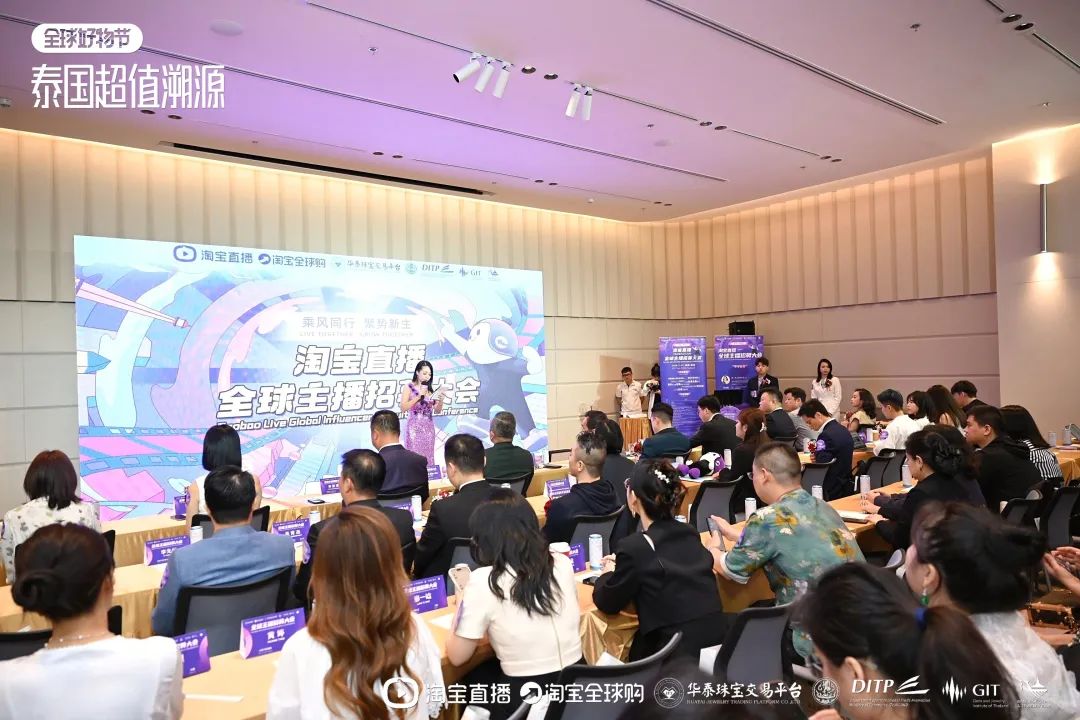 本次曼谷招募大会招募大会现场共邀请吸引含泰国商业部国际贸易促进司 副司长 蓬维特·斯拉昂先生、泰国珠宝学院 首席执行官 苏美德·巴松蓬先生、泰国华人青年商会会长李嘉淳先生、淘天集团-淘宝直播总经理叶镇参先生、淘天集团淘宝直播总监王一玫女士、域骉控股(广东)有限责任公司 董事长 李帅先生、萃玥珠宝品牌主理人易瑶瑶女士、诚好珠宝(广州)有限公司董事长刘文辉先生、淘天集团-淘宝直播生态运营主管白艳女士、泰国华泰集团、华泰珠宝交易平台董事长赵震东先生等领导代表、淘宝头部主播代表、泰中珠宝企业代表等嘉宾余150人参与。