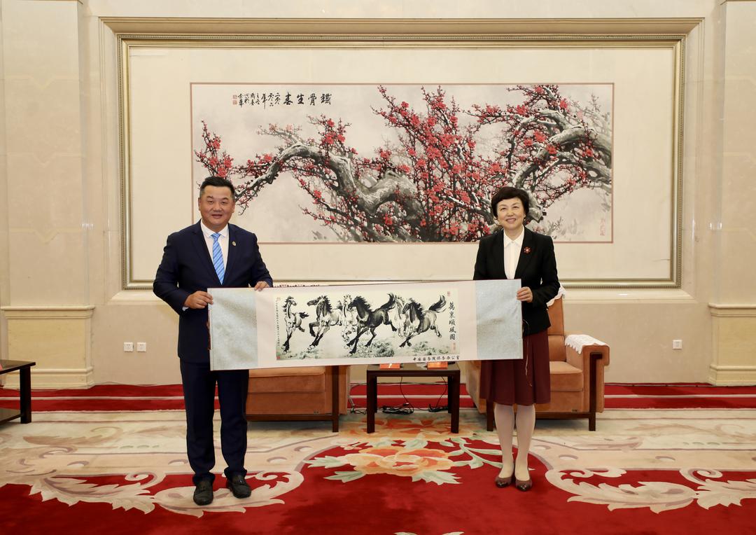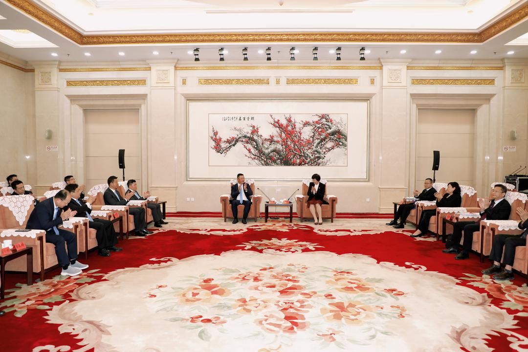 座谈会后,李嘉淳会长向陈旭主任赠送纪念品,陈旭主任回赠纪念品,并与青商会代表团合影留念。
