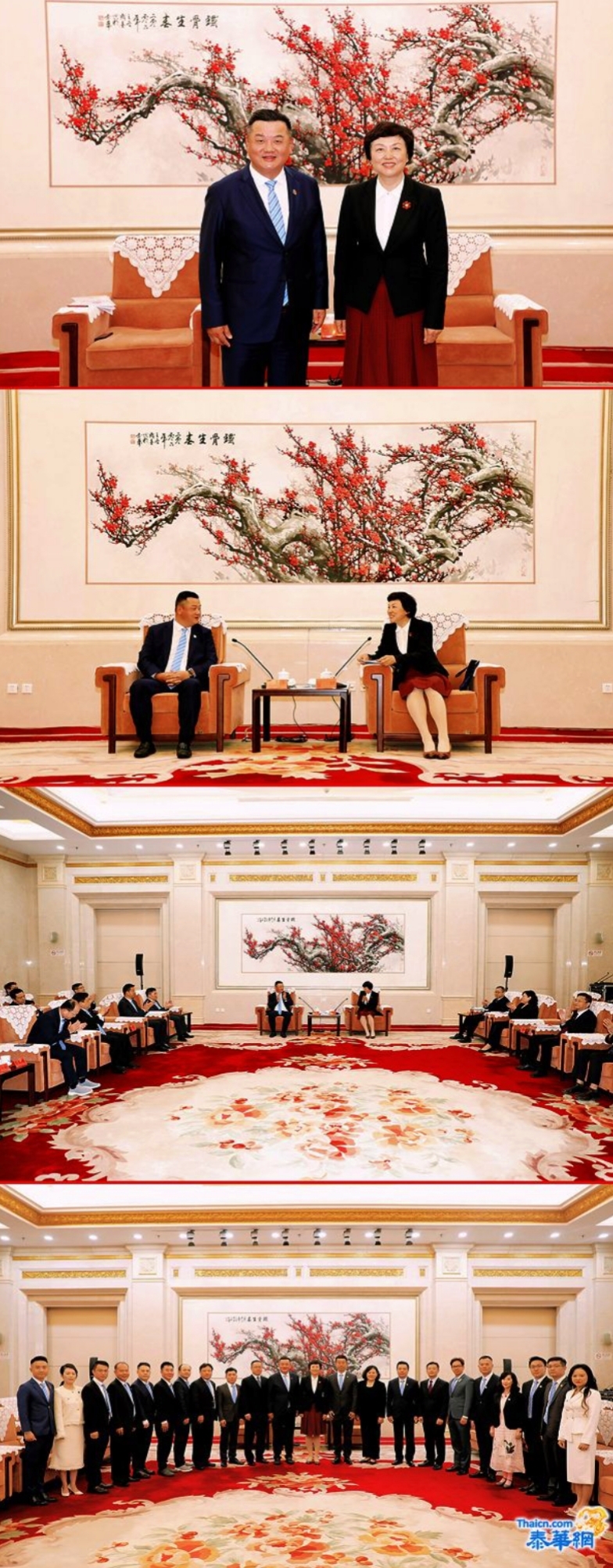 图一:中国国侨办主任陈旭与泰华青商会会长李嘉淳合影。图二:陈旭主任与李嘉淳会长亲切交谈。图三:会见座谈场面。图四:宾主合影留念。