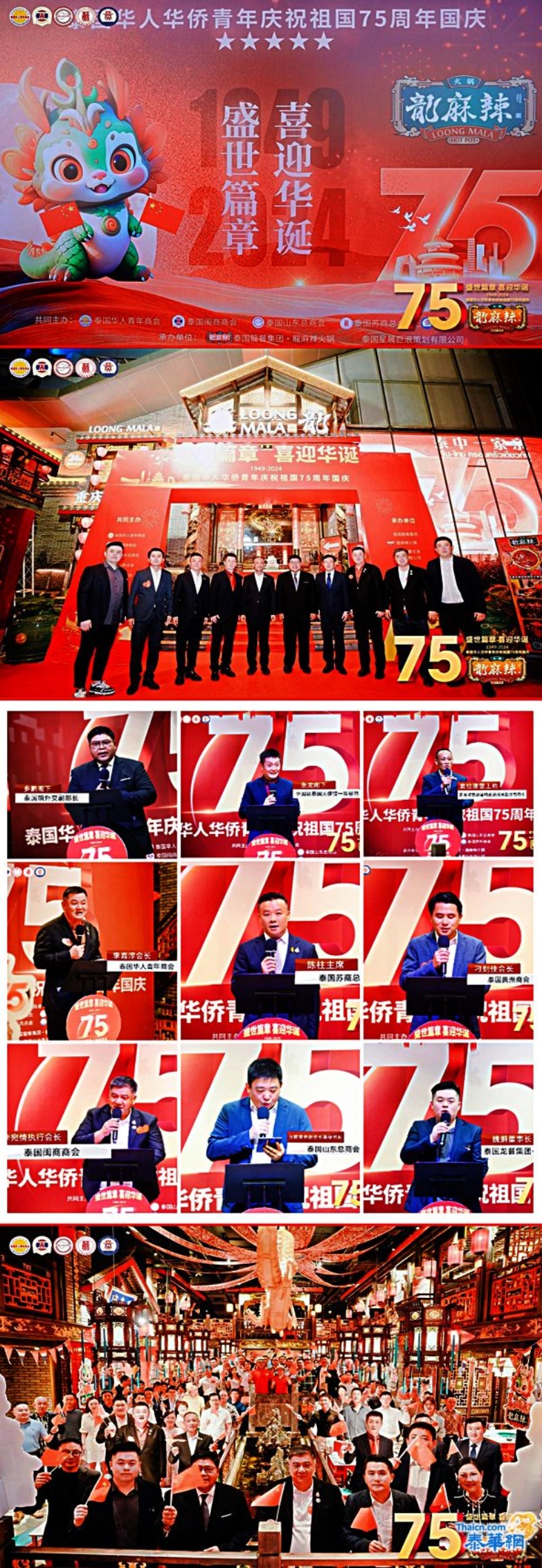 泰国前外交部副部长多鹏、中国驻泰国大使馆一等秘书 张龙、领事石锋;泰国警察总署特别顾问兼副总督察长 素拉蓬警上将、泰国华人青年商会 李嘉淳会长、泰国苏商总会陈柱主席、泰国贵州商会刁刻佳会长、泰国闽商商会李宛情执行会长、泰国山东总商会张鹏常务副会长兼秘书长、泰国龙餐集团·龙麻辣火锅魏鹏董事长等在泰商协会副会长及代表、在泰华人青年企业家代表约150人欢聚一堂,共庆祖国75周岁华诞!