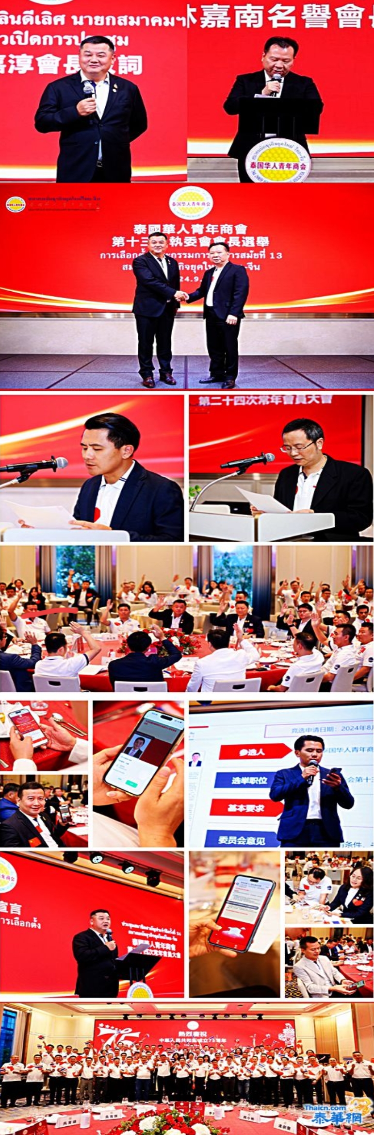 泰国华人青年商会第十二届执委会第十二次会议暨第二十四次常年会员大会于2024年9月30日,在泰国曼谷素立翁格兰德中心点酒店成功召开,大会特别恭请本会名誉会长林嘉南担任大会主席。大会进行新届会长选举,第十二届执委会会长李嘉淳蝉联第十三届会长!泰国华人青年商会第十二届执行委员会会长李嘉淳,常务副会长林玮、姚鸿春、李宛情,副会长周桂扬、李大成、黄少林、廖晓文、林晓东、陈柱、连剑丰(兼财务)、张楚武、周小彬、李先标、杨灿宜、吴育雄、刁刻佳(兼秘书长)、黎孔林、魏勇等80余位常执委及会员出席。此次会议主持由副秘书长赵子杰担任。