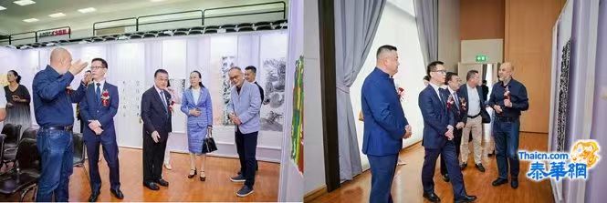 泰王国教育部信息与通信技术中心主任兼教育部办公厅信息系统技术顾问伊提功•昌萨空先生;中华人民共和国驻泰王国大使馆文化处杨晓龙参赞;泰国华文民校协会黄迨光主席;中国美术学院教授、博士生导师、中国善琏汉字艺术研究院院长王晓明;泰国华人青年商会李嘉淳会长;朱拉隆功大学孔子学院韩圣龙院长;碧查汶大学前校长,著名艺术家舒瓦教授;北大培文汉字艺术研究中心主任濮列平;北京第二外国语大学教授常耀华;天津师范大学教授王昊;泰国华文教师公会副主席、泰国华人青年商会会长助理马宁伽;全泰中国学生学者联合会主席王鹏;泰中文化人联合会欧阳嘉运主席;泰国北京总商会张静常务副主席;泰国贵州商会刁刻佳会长;泰国闽商商会蔡孝兴会长;泰国江苏总商会张彬会长、孙经树执行会长;曼松德昭帕亚皇家师范大学孔子学院中方院长杜一宁;泰国湖北总商会韩宗渭会长;环泰集团总裁,泰国Pure Chem Co., Ltd 董事长康国锋;Pure Chem Co., Ltd 总裁办主任高蕙玲;前泰国驻中国大使馆投资参赞、泰国BOI 中国区主任吴永泉;泰国“泰文中写书道”发起人、泰国“道韵疏经十八式”研究学会发起人、泰国太极拳总会中文秘书长、古汉语现场翻译黄嘉良;香港汉港控股董事,中国汉字艺术发展有限公司(香港)董事长陈响玲;泰国JC Intermarketing Co., Ltd 董事长林时荣;上海浦东新区政协主任;中国善琏汉字艺术研究院副院长陈继忠;中国善琏汉字艺术研究院美育发展部主任刘赟;大理大学教授冬青;合肥经济技术职业学院靖婧;殿选文庭书画艺术馆馆长、见山系列对话主持陈河村;中国观赏石协会画面石专委会、场馆传承发展专委会副主任张亚平;艺术家丁亮、陈汪洋、王恒欢以及来自泰国龙仔厝三才公学、曼达纳鲁蒙学校、通普朗寺学校、佛统网銮公立健华学校、佛丕府光中公学、泰国法政大学、泰国朱拉隆功大学师生及研究学者代表共200余人共同出席开幕式。