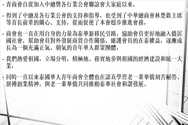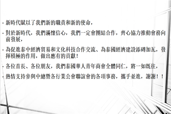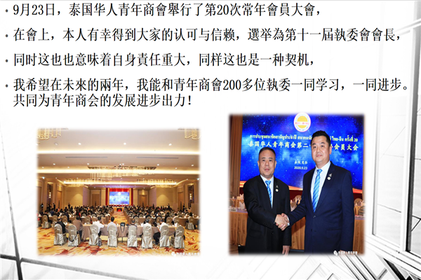 青商会自从加入中总暨各行业公会联谊会大家庭以来,得到了中总及各行业公会的支持和指导,也受到了中华总商会林楚钦主席等首长的关心、支持,从而促使本会稳步推进会务,商会也一直在用自身的力量为泰华新移民引路,协助会员更好地融入侨居国社会,帮助会员对外发展商贸合作关系,维护会员的在泰权益,逐渐成长为一个充满正气、朝气的青年华人群众团体,我们热爱祖国,立场分明,积极地、务实地参与祖国的经济建设和统一大业,同时一直以来泰国华人青年商会全体也在认真学习老一辈华侨刻苦耐劳、拼搏创业精神,与老一辈华侨共同推动泰华社会和谐发展。新时代赋以了我们新的职责和新的使命,对于新时代,我们满怀信心,我们一定会团结合作,齐心协力推动会务向前发展,为促进泰中经济贸易和文化科技合作交流、为泰国经济建设添砖加瓦,发挥积极的作用,做出应有的贡献!各位首长、各位朋友,我们泰国华人青年商会全体同仁,将一如既往,热情支持参与中总暨各行业公会联谊会的各项事务,携手并进,谢谢!