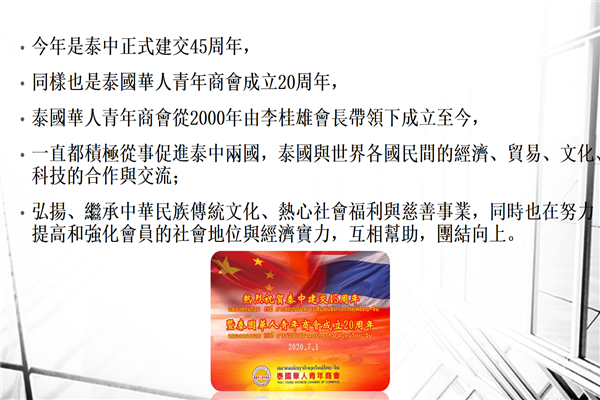 今年是泰中正式建交45周年,同样也是泰国华人青年商会成立20周年,泰国华人青年商会从2000年由李桂雄会长带领下成立至今,一直都积极从事促进泰中两国,泰国与世界各国民间的经济、贸易、文化、科技的合作与交流;弘扬、继承中华民族传统文化、热心社会福利与慈善事业,同时也在努力提高和强化会员的社会地位与经济实力,互相帮助,团结向上。