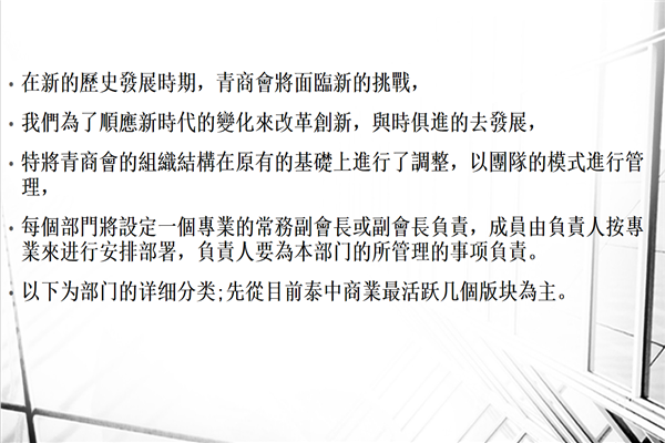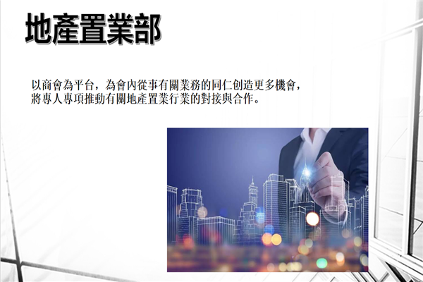 5、地产置业部:在海外置业成为近些年许多人的海外投资目标,商会设立此部门,主要目的是以商会为平台,为会内从事有关业务的同仁创造更多机会,将专人专项推动有关地产置业行业的对接与合作。