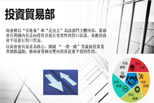 1、投资贸易部:商会将以“引进来”和“走出去”为该部门主体内容,紧扣国际投资发展的新形势,帮助会员将个人企业与国内有意向投资者进行实质性的对口洽谈,并应用商会的平台进行对口贸易, 以商会会员需求为核心,以提升投资实效为目的,紧紧围绕 “一带一路”等最新投资业界热点议题,将商会发挥出双向投资促进平台的作用