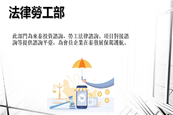2、法律劳工部:随着祖国“一带一路”政策的实施与泰国工业4.0政策的不断推进,越来越多的中国企业来泰投资,同时也与商会会员企业有了更多的对接,商会将设立此部门为来泰投资咨询,劳工法律咨询、项目对接咨询等提供咨询平台,为会员企业在泰发展保驾护航。
