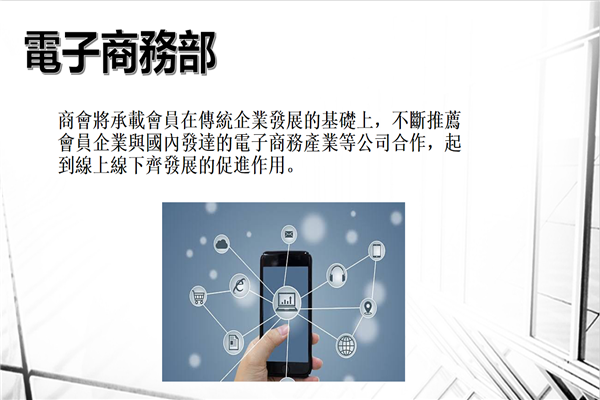 3、电子商务部:电子商务的不断兴起,商会会员的传统企业的发展脚步也逐渐步入到电子商务行列中,商会将承载会员在传统企业发展的基础上,不断推荐会员企业与国内发达的电子商务产业等公司合作,起到在线线下齐发展的促进作用。