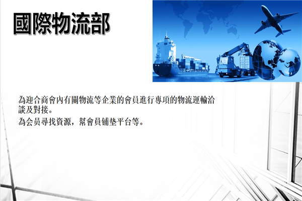4、国际物流部:商会专设此部门,为迎合商会内有关物流等企业的会员进行专项的物流运输洽谈及对接,为会员寻找资源,帮会员铺垫平台等。