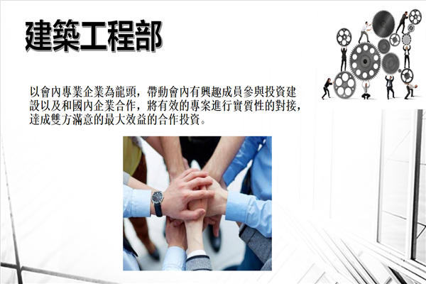 6、建筑工程部:近年来,祖国经济取得迅速发展,在共建“一带一路”的倡议下,从而带动了建筑行业加快走向海外的发展步伐。商会设立此部门,主要以会内专业企业为龙头,带动会内有兴趣成员参与投资建设以及和国内企业合作,将有效的项目进行实质性的对接,达成双方满意的最大效益的合作投资。