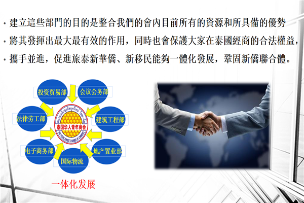 建立这些部门的目的是整合我们的会内目前所有的资源和所具备的优势,将其发挥出最大最有效的作用,同时也会保护大家在泰国经商的合法权益,携手并进,促进旅泰新华侨、新移民能够一体化发展,巩固新侨联合体。